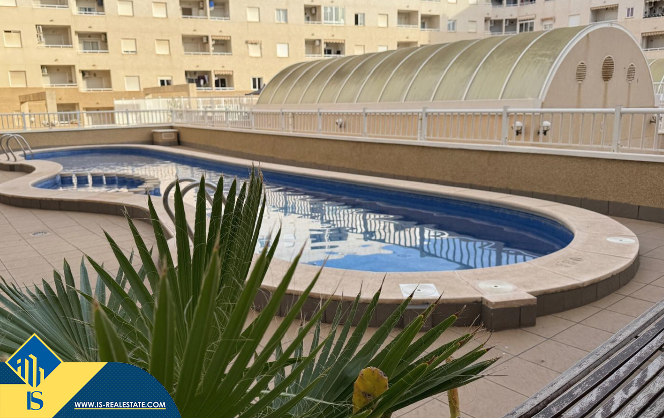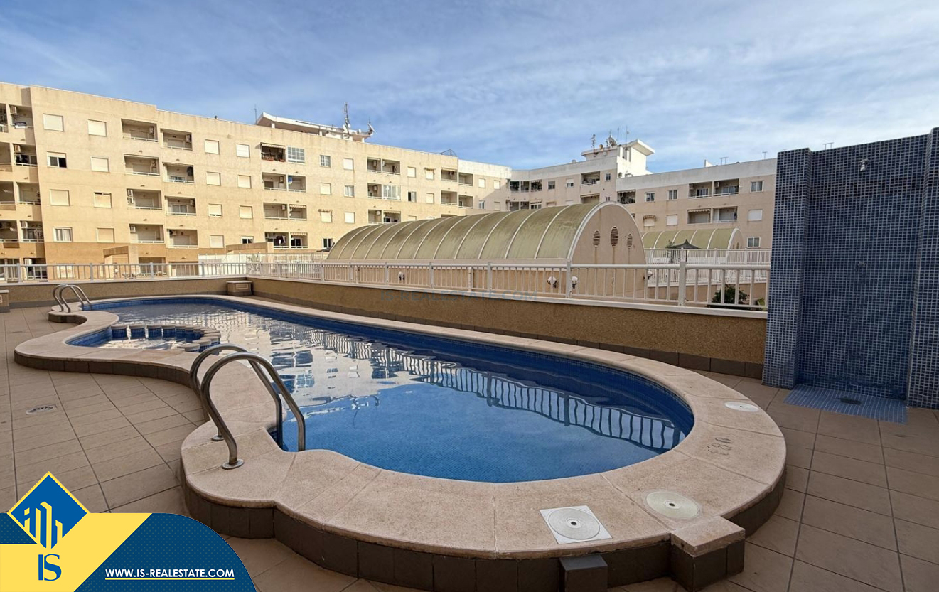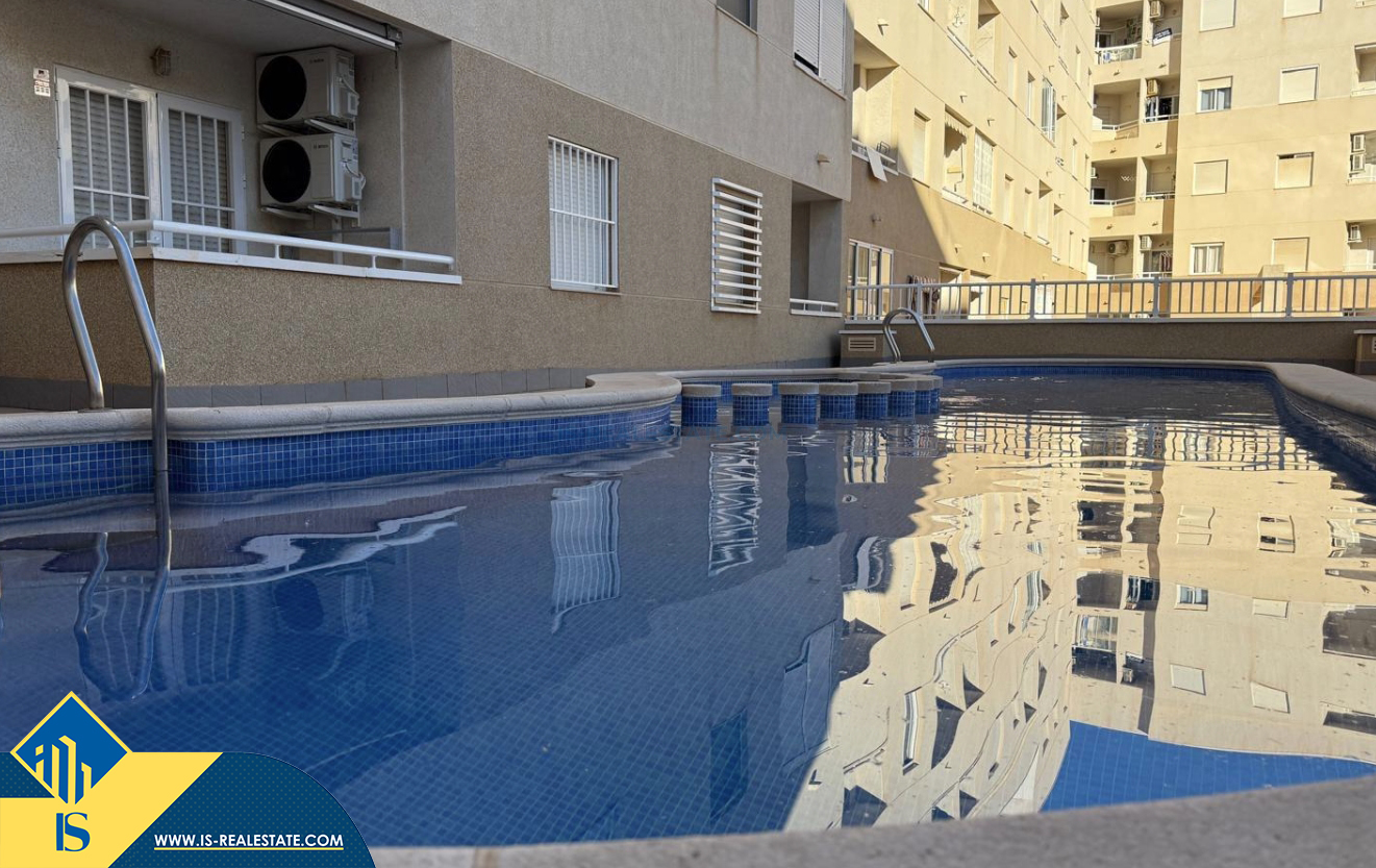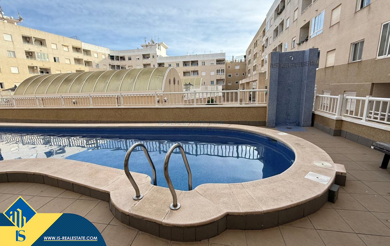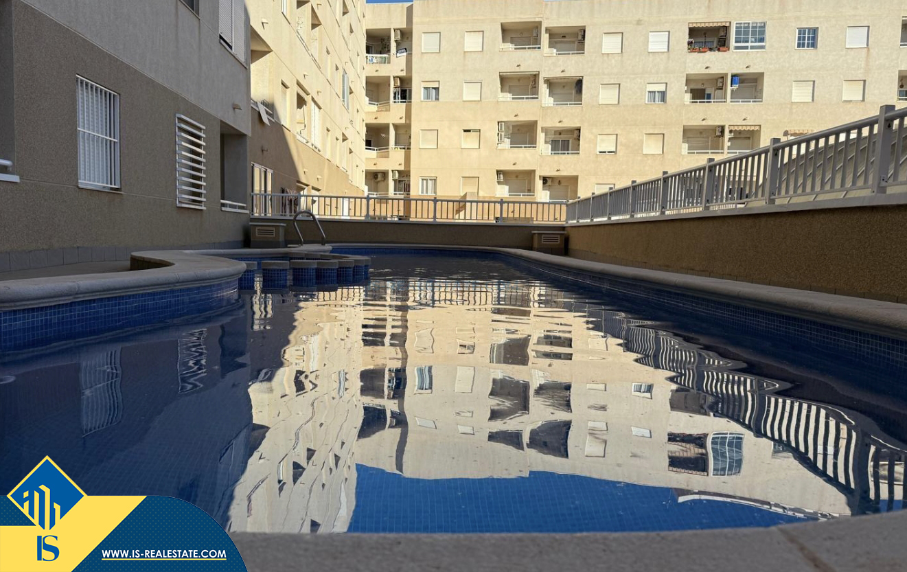 3-jų kambarių apartamentas su bendru baseinu, Ispanijoje, Alicante provincijoje, Torrevieja mieste, bendras plotas 64 m², 2 kilometrai iki jūros, 45 kilometrai iki Alicante oro uosto. Turtui priklauso bendras baseinas, terasa, liftas, garažas. Netoli turto yra parduotuvės, restoranai, vaistinės, autobusų stotelės, degalinės, žalios zonos, kavinės