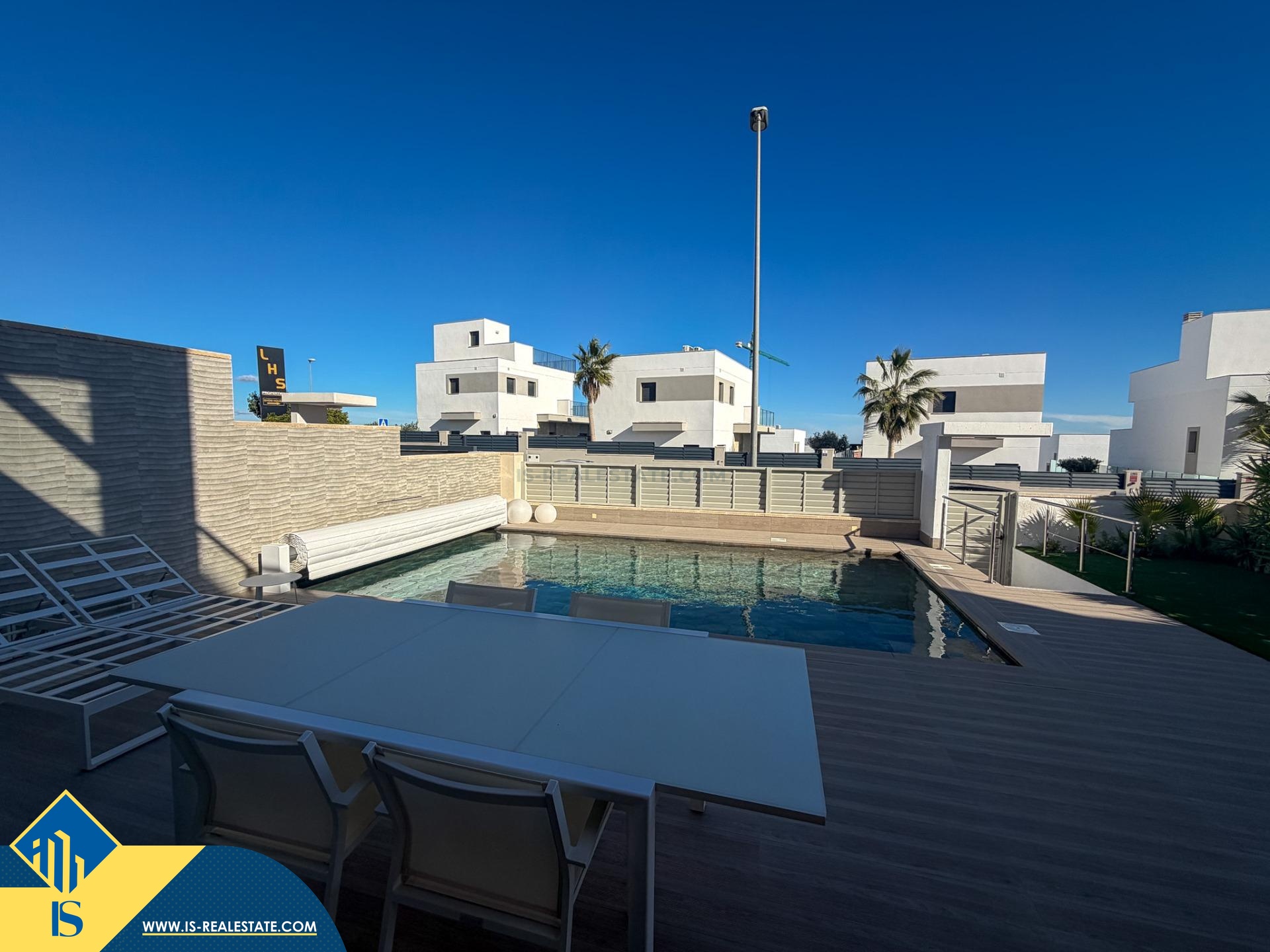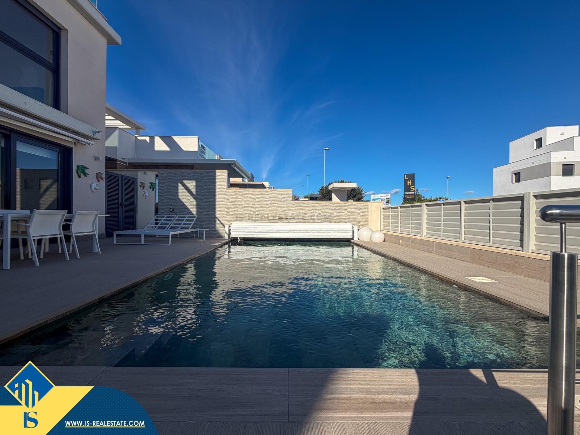 5-ių kambarių vila su privačiu baseinu, Ispanijoje, Alicante provincijoje, San Miguel de Salinas mieste, bendras plotas 165 m², 7 kilometrai iki jūros, 45 kilometrai iki Alicante miesto oro uosto. Turtui priklauso terasa, privatus baseinas, vieta automobiliui. Netoli turto yra parduotuvės, restoranai, vaistinės, autobusų stotelės, degalinės, žalios zonos, kavinės