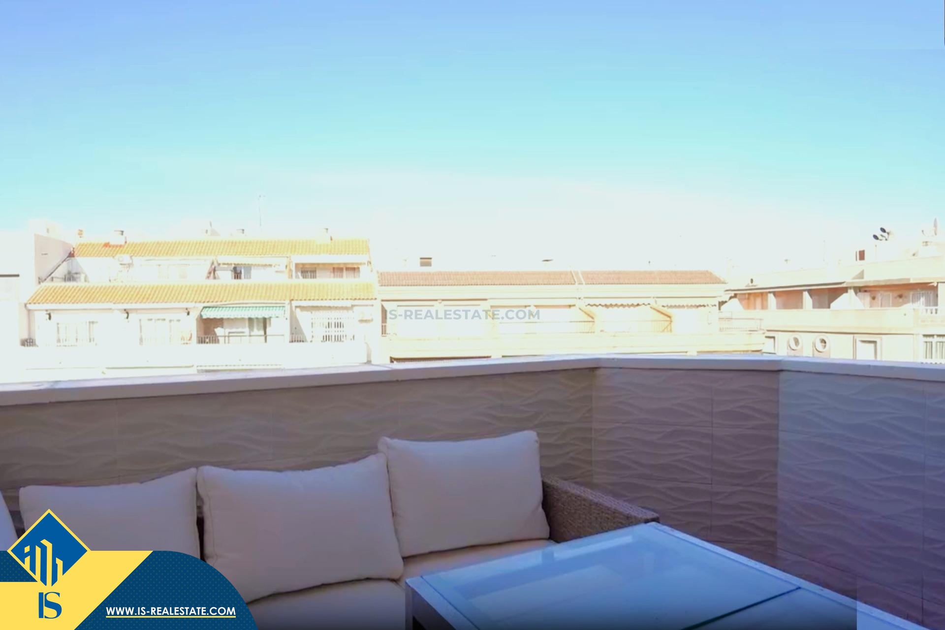 4-ių kambarių penthouse apartamentas su terasa, Ispanijoje, Alicante provincijoje, Torrevieja mieste, Playa del Cura rajone, bendras plotas 89 m², 500 metrų iki jūros, 45 kilometrai iki Alicante oro uosto. Turtui priklauso terasa. Netoli turto yra parduotuvės, restoranai, autobusų stotelės, degalinės, žalios zonos, kavinės, vaistinės