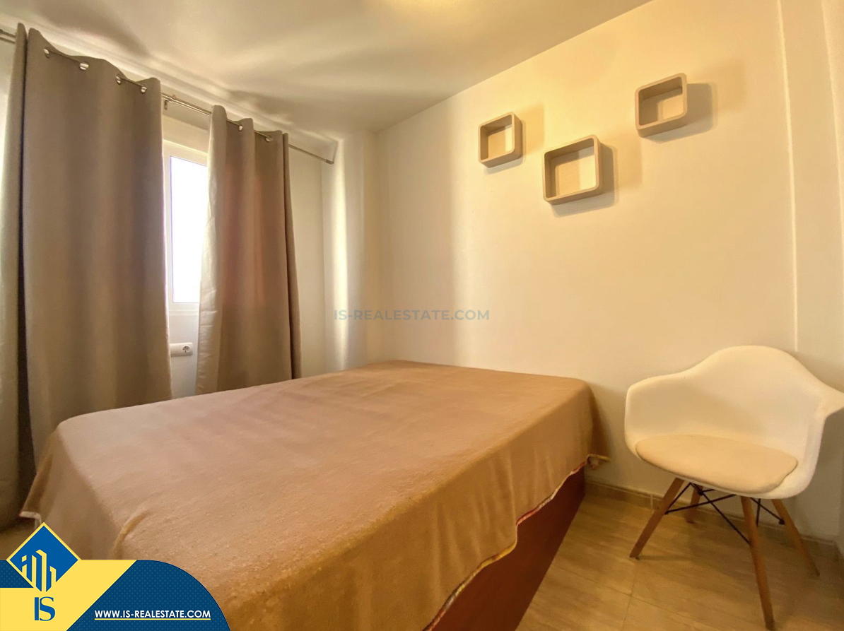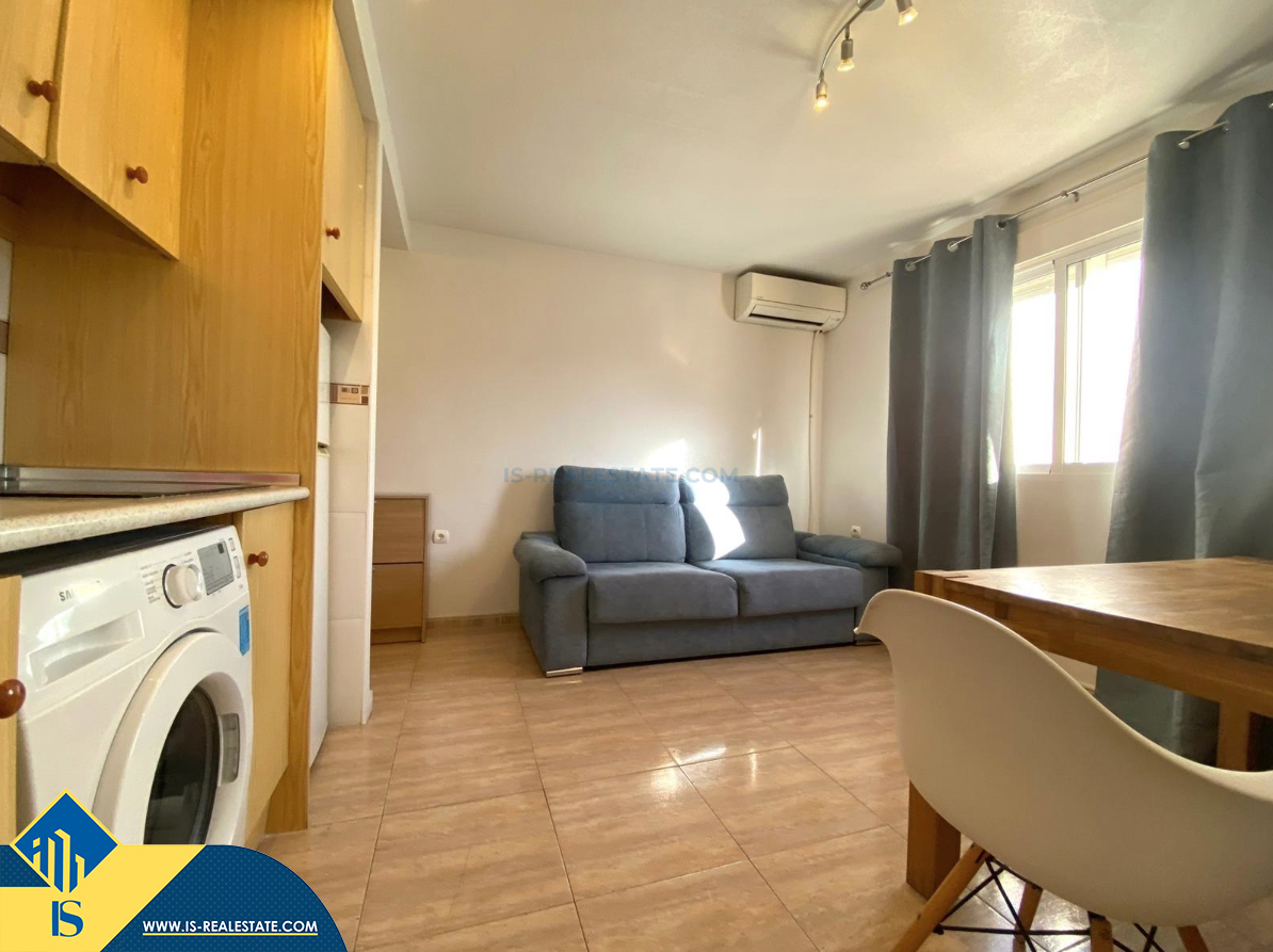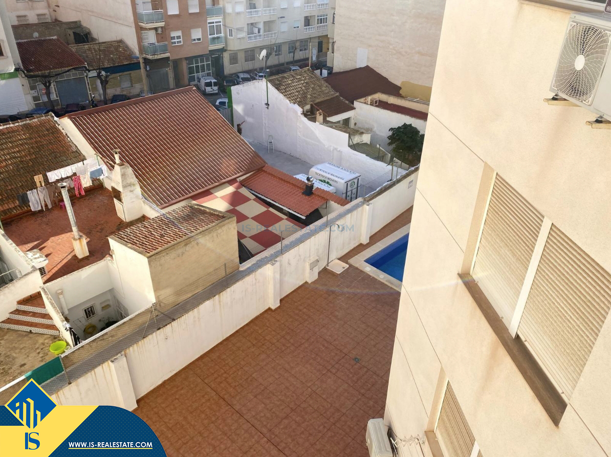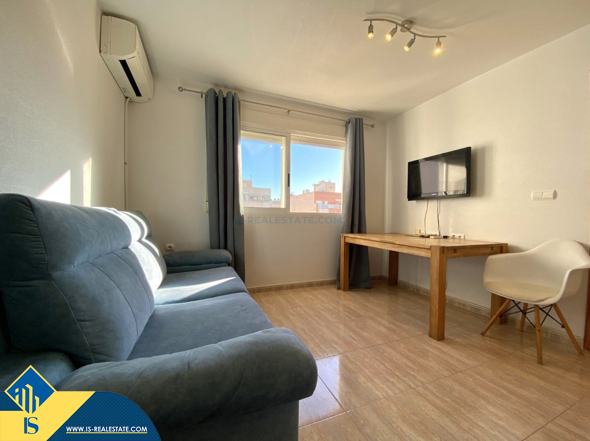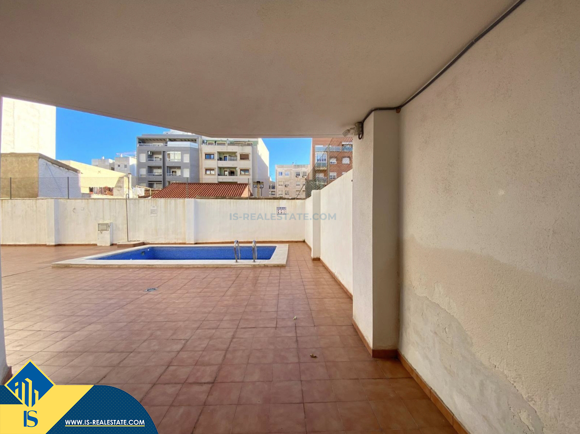 2-jų kambarių apartamentas su bendru baseinu, Ispanijoje, Alicante provincijoje, Torrevieja mieste, bendras plotas 38 m², 1.5 kilometro iki jūros, 45 kilometrai iki Alicante oro uosto. Turtui priklauso bendras baseinas, terasa, liftas, vieta automobiliui. Netoli turto yra parduotuvės, restoranai, vaistinės, autobusų stotelės, degalinės, žalios zonos, kavinės