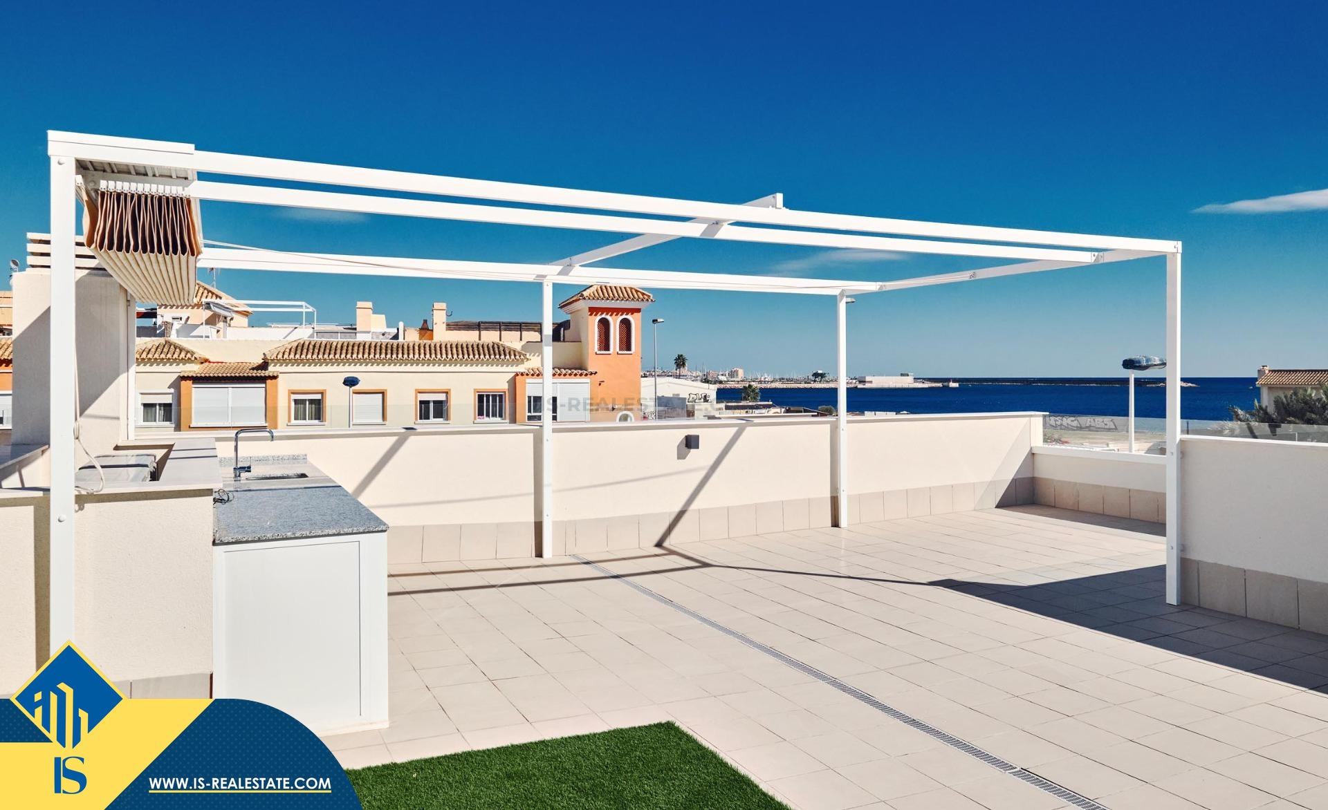 3-jų kambarių bungalas su bendru baseinu, Ispanijoje, Alicante provincijoje, Torrevieja mieste, Playa del Acequión rajone, bendras plotas 160 m², 200 metrų iki jūros, 45 kilometrai iki Alicante miesto oro uosto. Netoli turto yra parduotuvės, restoranai, vaistinės, autobusų stotelės, degalinės, žalios zonos, kavinės