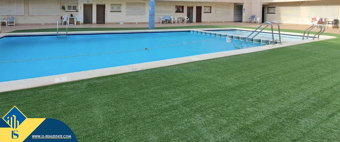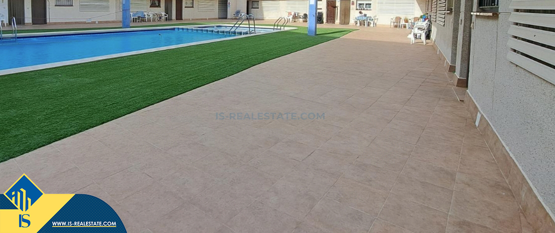 2-jų kambarių apartamentas su bendru baseinu, Ispanijoje, Alicante provincijoje, Torrevieja mieste, bendras plotas 65 m², 400 metrų iki jūros, 45 kilometrai iki Alicante oro uosto. Turtui priklauso bendras baseinas, terasa. Netoli turto yra parduotuvės, restoranai, vaistinės, autobusų stotelės, degalinės, žalios zonos, kavinės