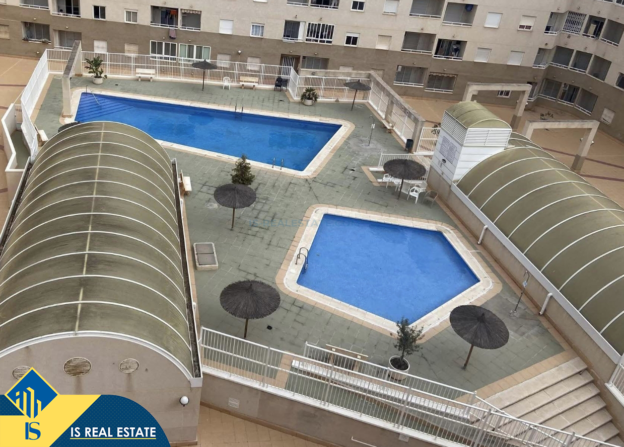 3-jų kambarių apartamentas su bendru baseinu, Ispanijoje, Alicante provincijoje, Torrevieja mieste, bendras plotas 63 m², 900 metrų iki jūros, 45 kilometrai iki Alicante oro uosto. Turtui priklauso bendras baseinas, terasa, balkonas, liftas. Netoli turto yra parduotuvės, restoranai, vaistinės, autobusų stotelės, degalinės, žalios zonos, kavinės