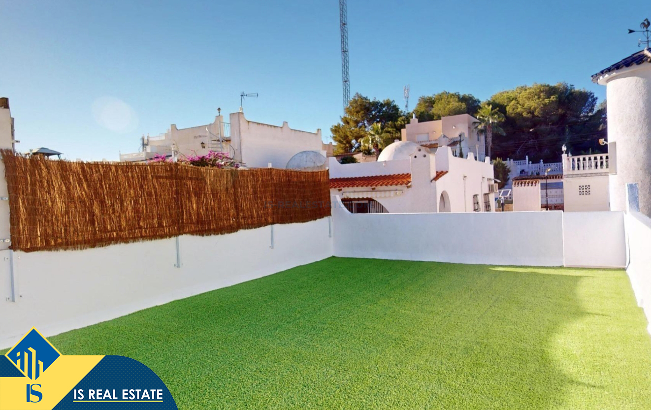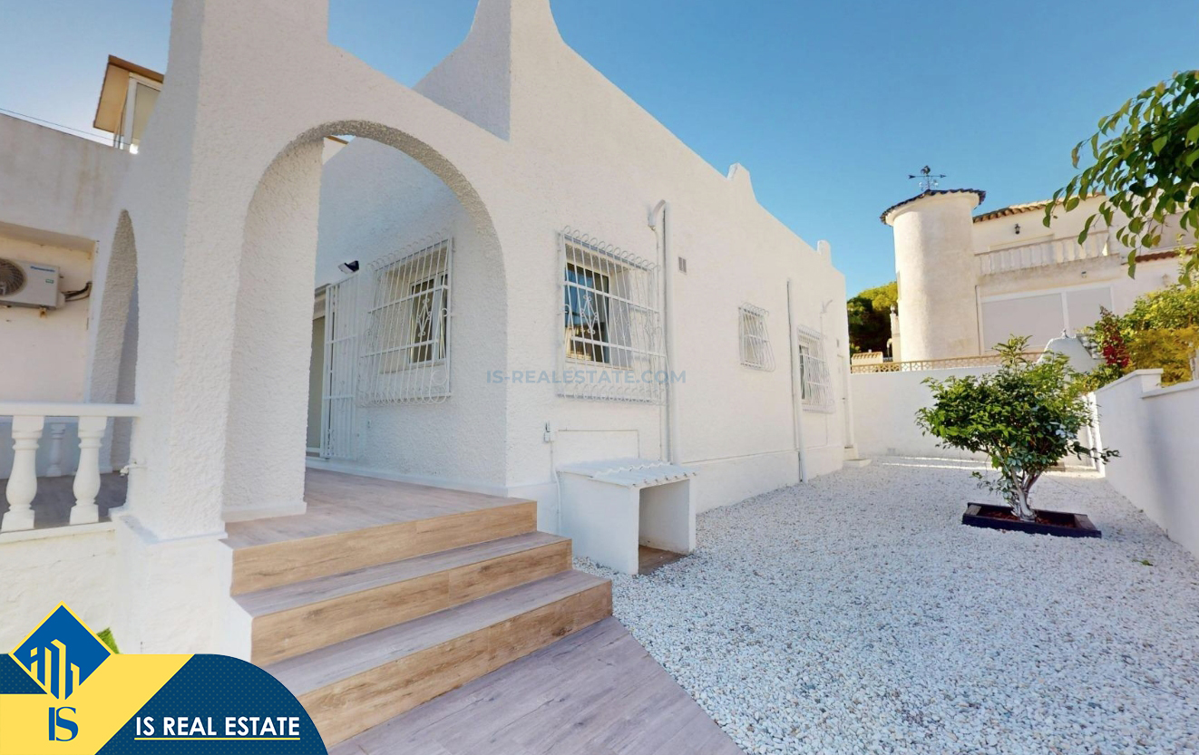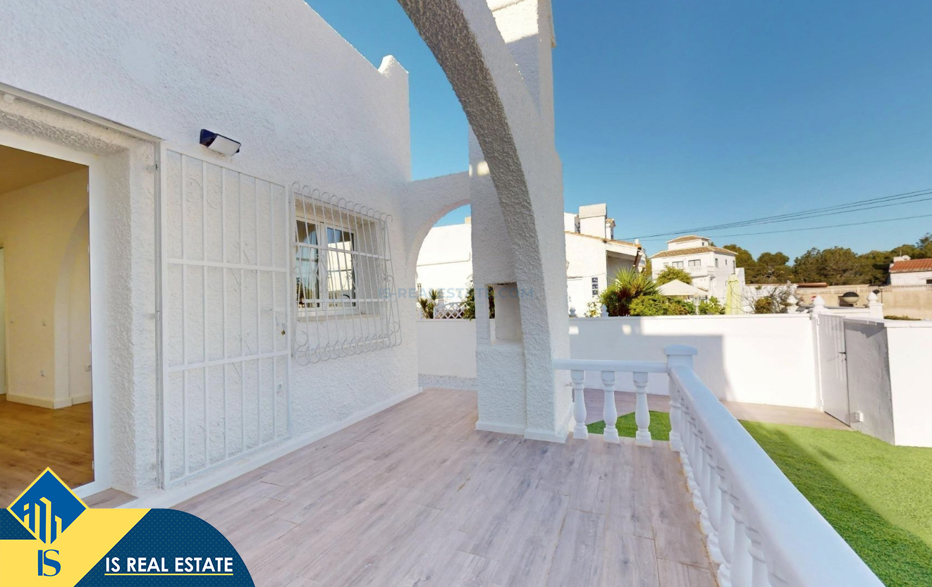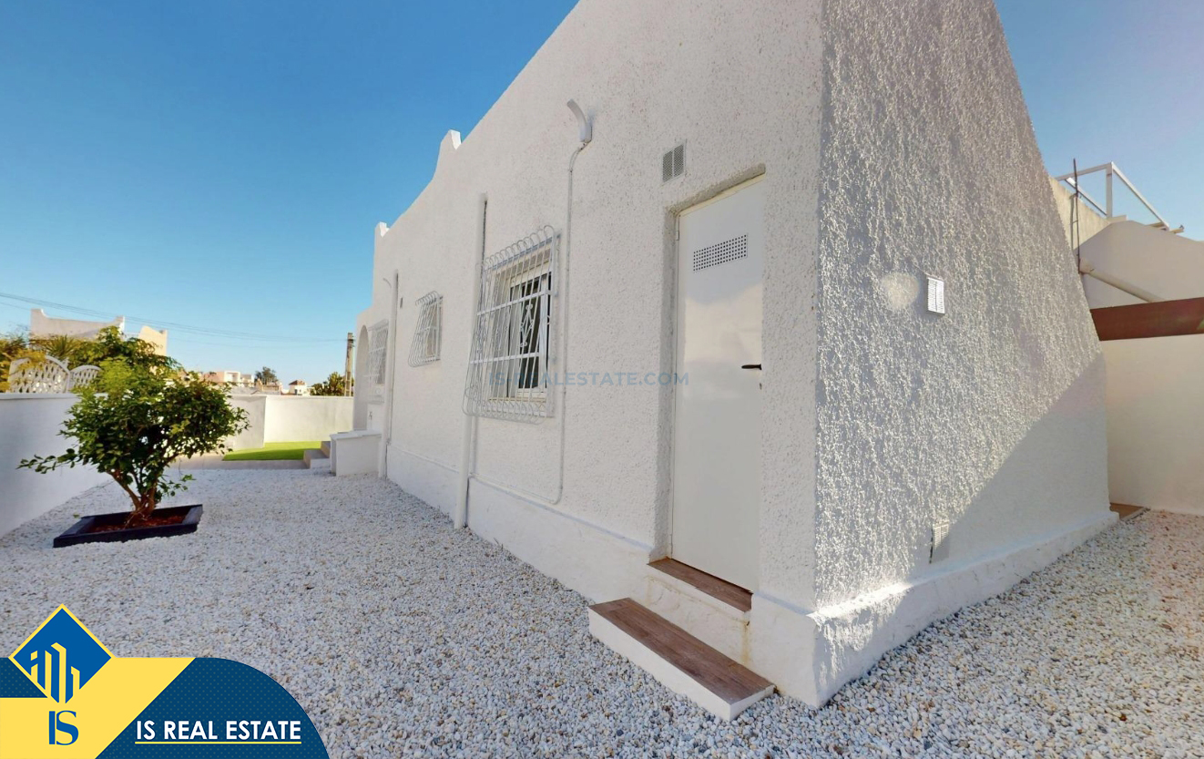 3-jų kambarių renovuotas bungalas su terasa, Ispanijoje, Alicante provincijoje, Orihuela Costa mieste, bendras plotas 62 m², 6 kilometrai iki jūros, 57 kilometrai iki Alicante oro uosto. Turtui priklauso terasa, soliariumas, sandėliukas, privatus kiemas. Netoli turto yra parduotuvės, restoranai, autobusų stotelės, vaikų zonos, degalinės, žalios zonos, kavinės, ligoninė