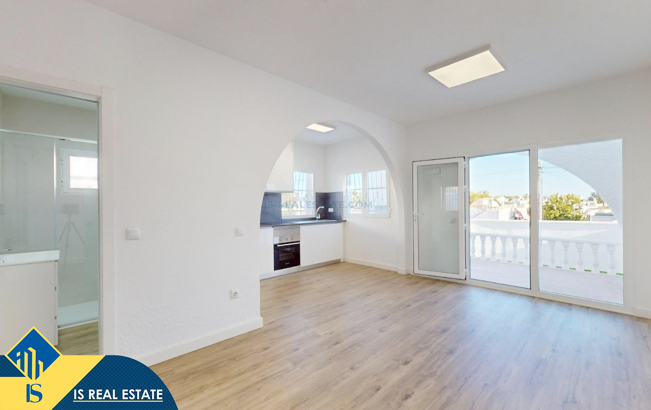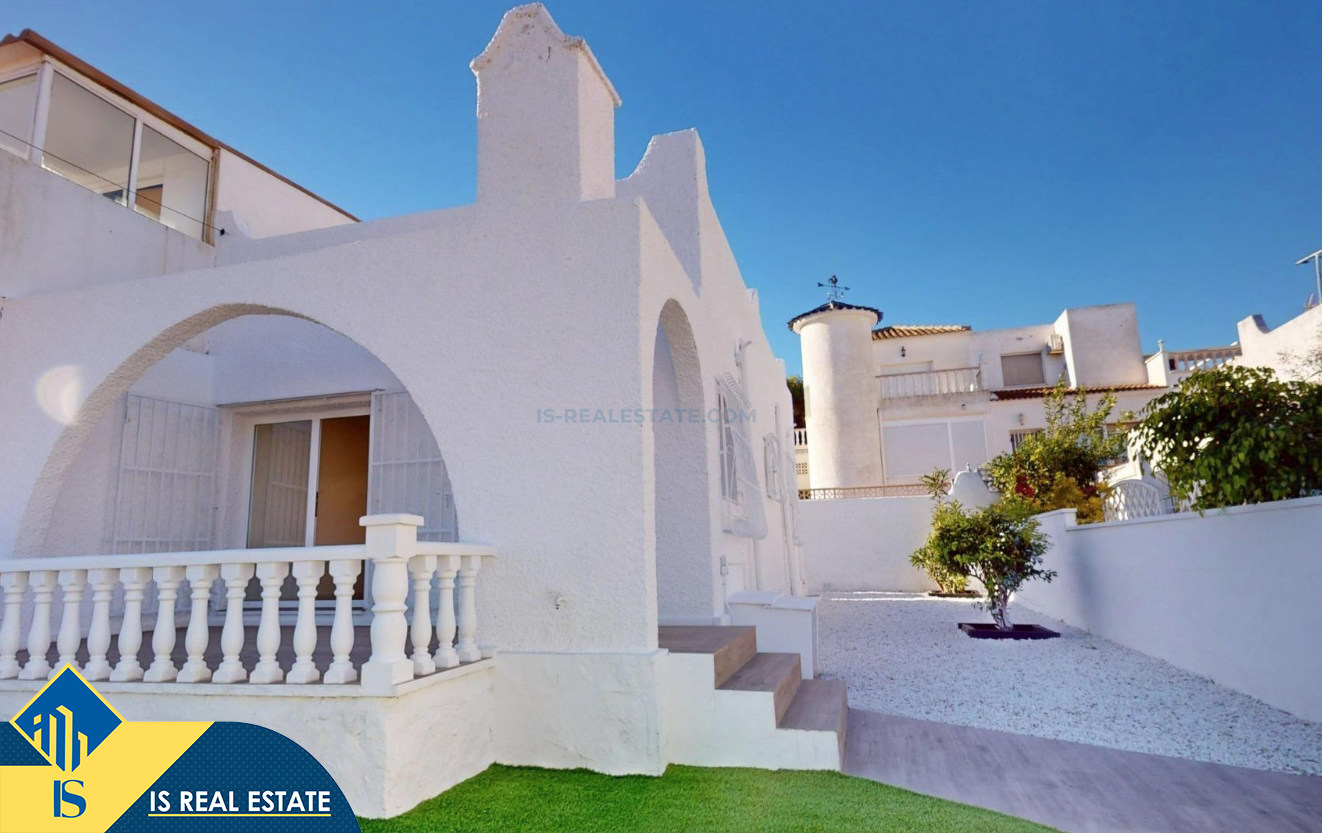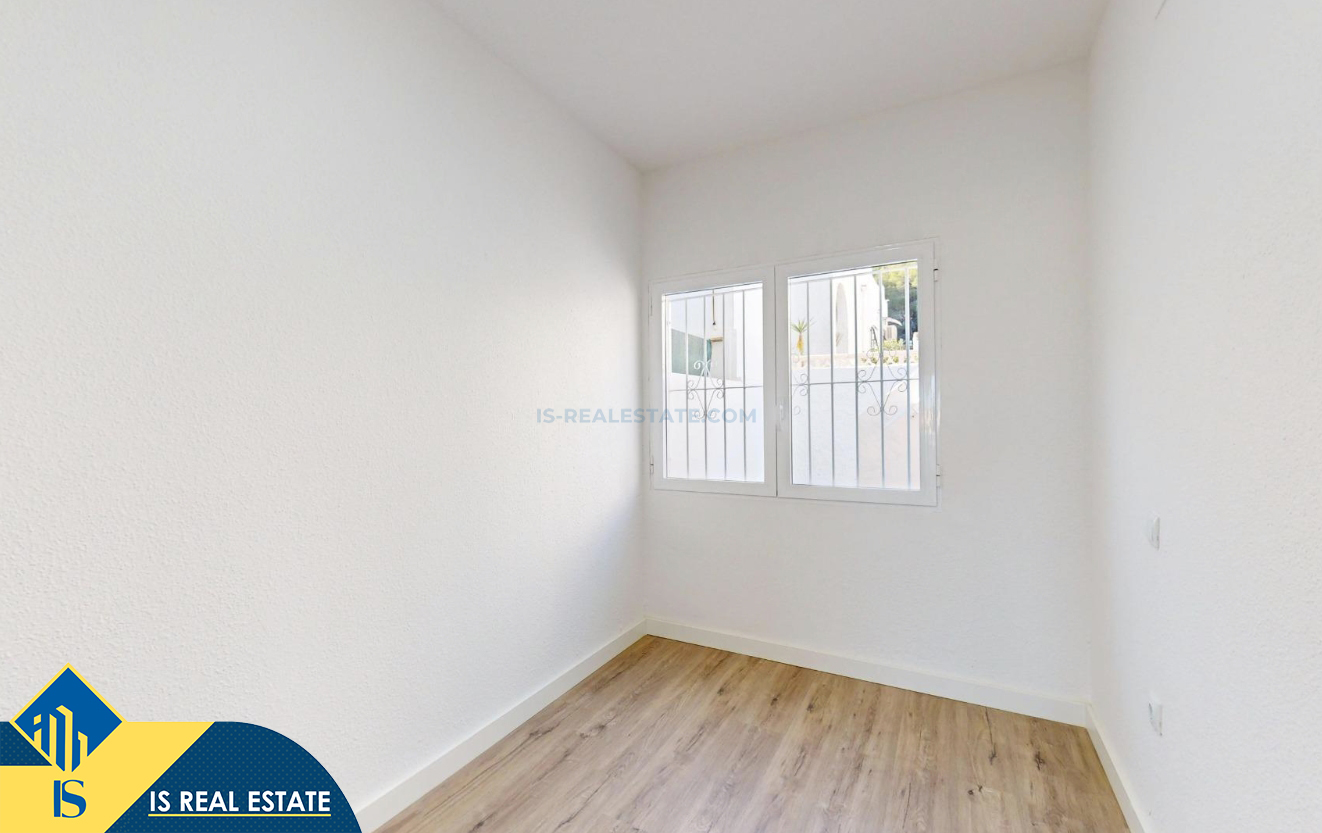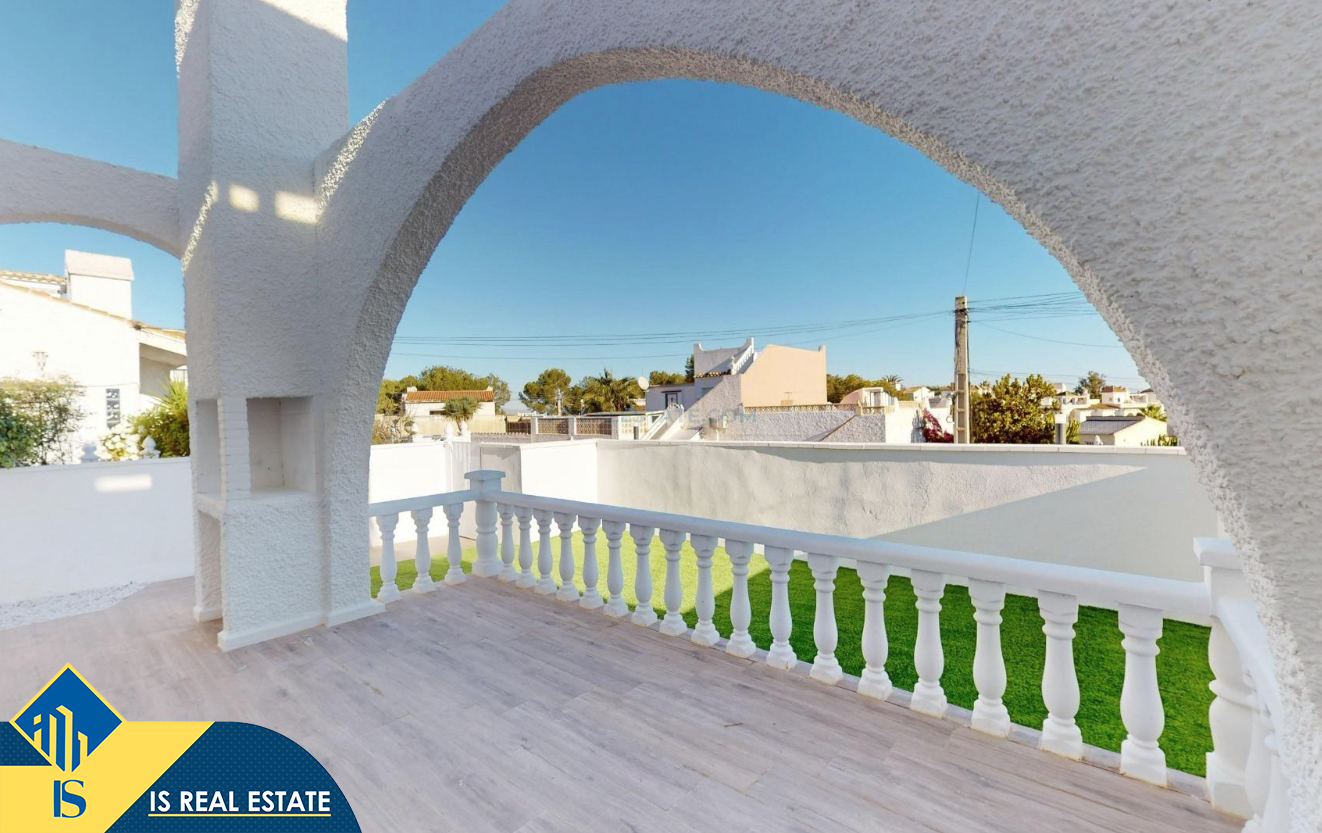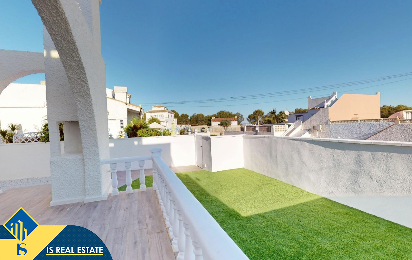 3-jų kambarių renovuotas bungalas su terasa, Ispanijoje, Alicante provincijoje, Orihuela Costa mieste, bendras plotas 62 m², 6 kilometrai iki jūros, 57 kilometrai iki Alicante oro uosto. Turtui priklauso terasa, soliariumas, sandėliukas, privatus kiemas. Netoli turto yra parduotuvės, restoranai, autobusų stotelės, vaikų zonos, degalinės, žalios zonos, kavinės, ligoninė
