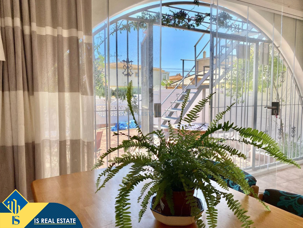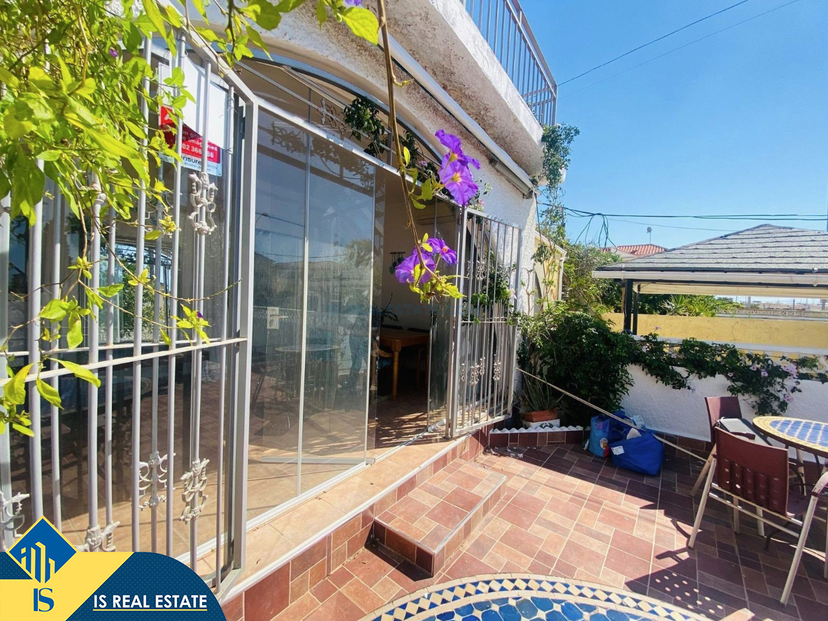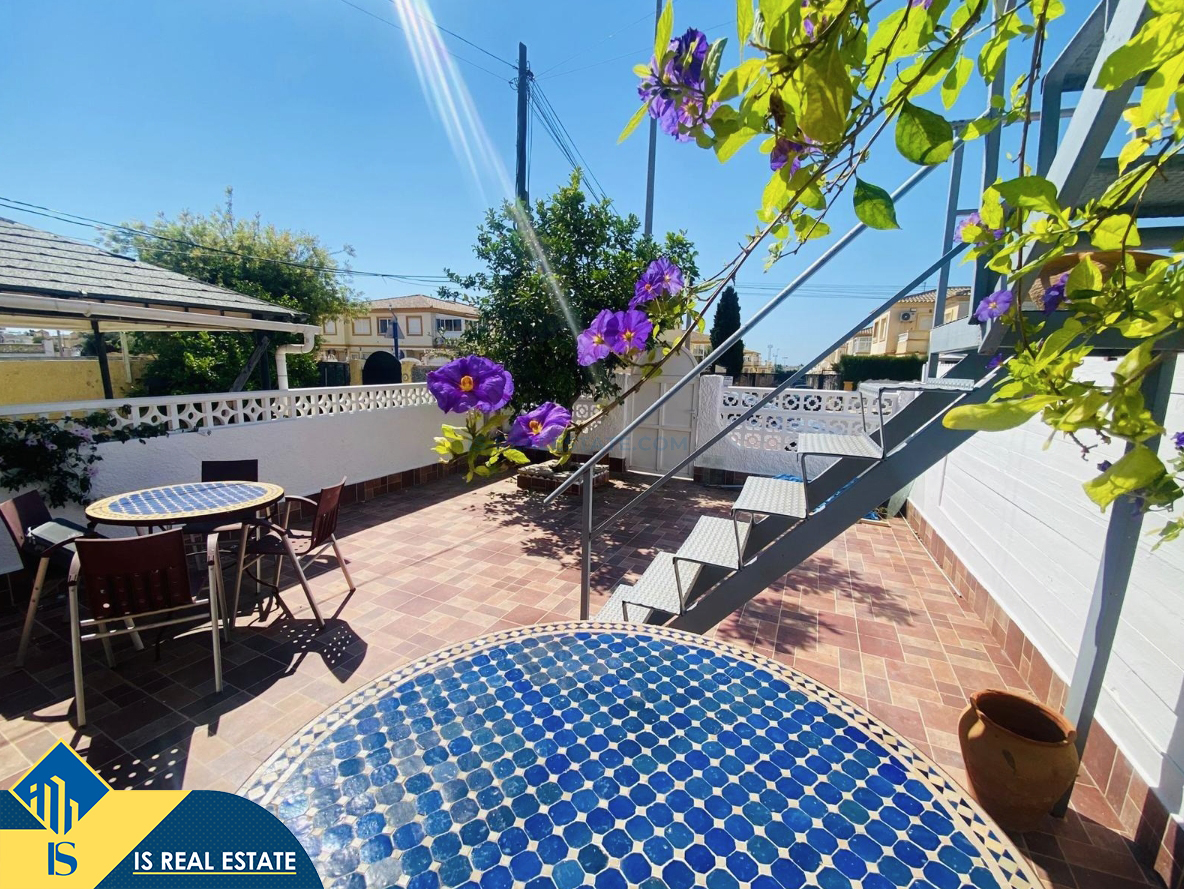 3-jų kambarių renovuotas bungalas su terasa, Ispanijoje, Alicante provincijoje, Orihuela Costa mieste, bendras plotas 75 m², 2.5 kilometro iki jūros, 57 kilometrai iki Alicante oro uosto. Turtui priklauso terasa, soliariumas, vieta automobiliui, sandėliukas, privatus kiemas. Netoli turto yra parduotuvės, restoranai, autobusų stotelės, vaikų zonos, degalinės, žalios zonos, kavinės, ligoninė