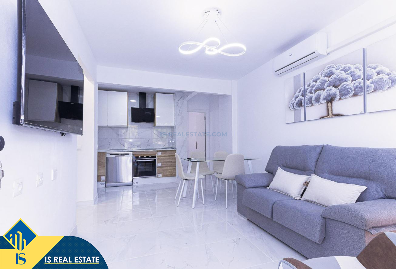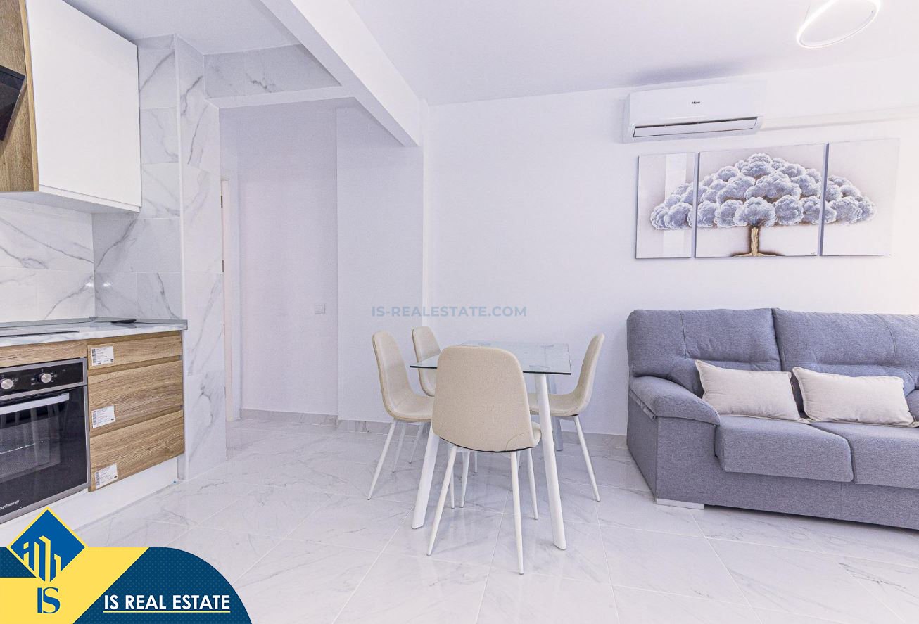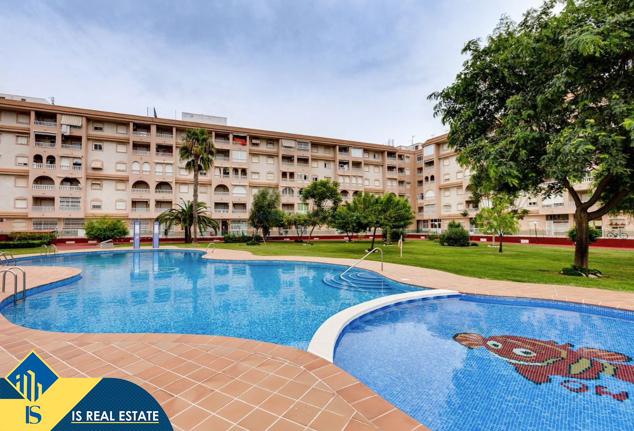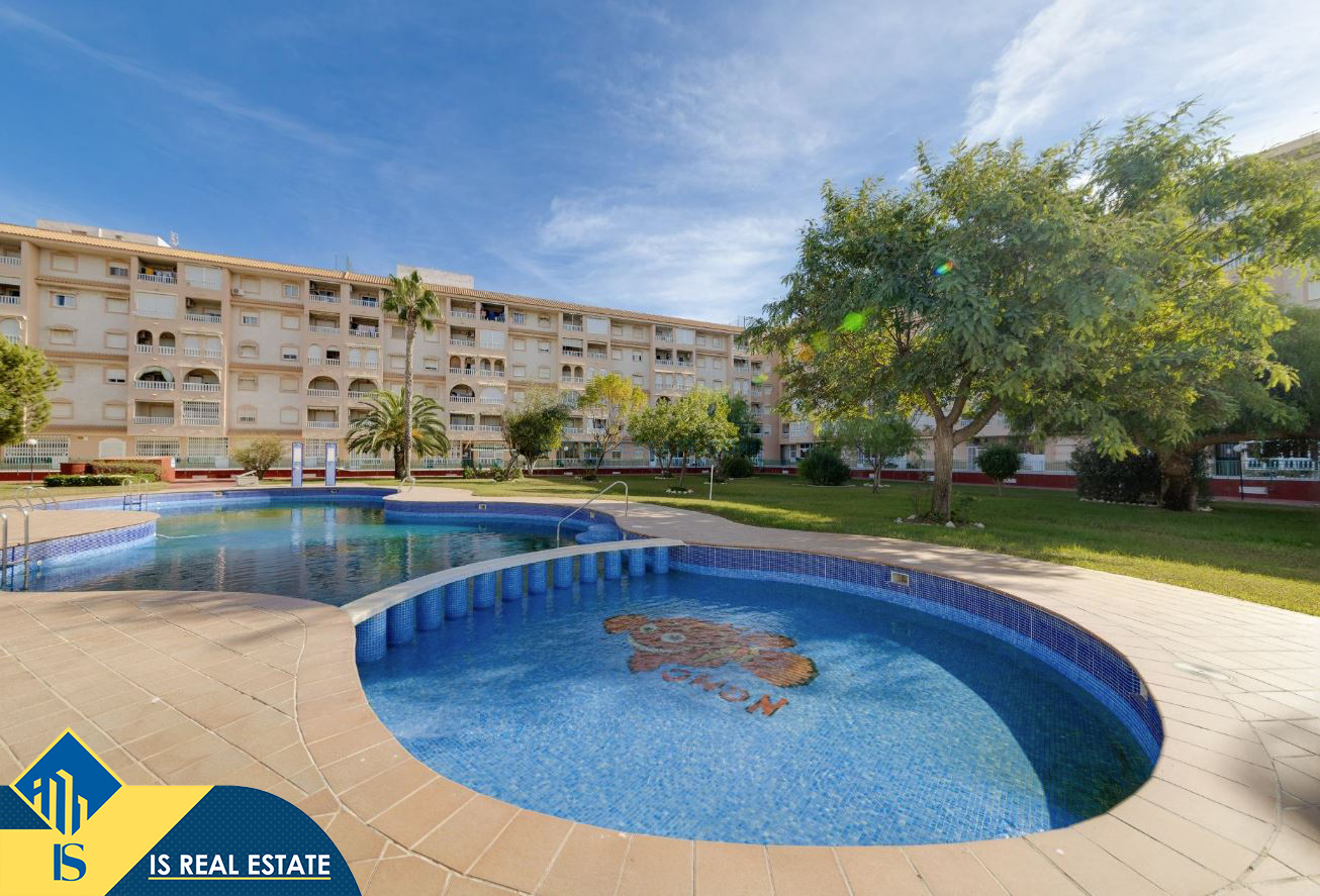 3-jų kambarių renovuotas apartamentas su bendru baseinu, Ispanijoje, Alicante provincijoje, Torrevieja mieste, bendras plotas 52 m², 750 metrų iki jūros, 45 kilometrai iki Alicante oro uosto. Turtui priklauso bendras baseinas, terasa, liftas. Netoli turto yra parduotuvės, restoranai, vaistinės, autobusų stotelės, degalinės, žalios zonos, kavinės