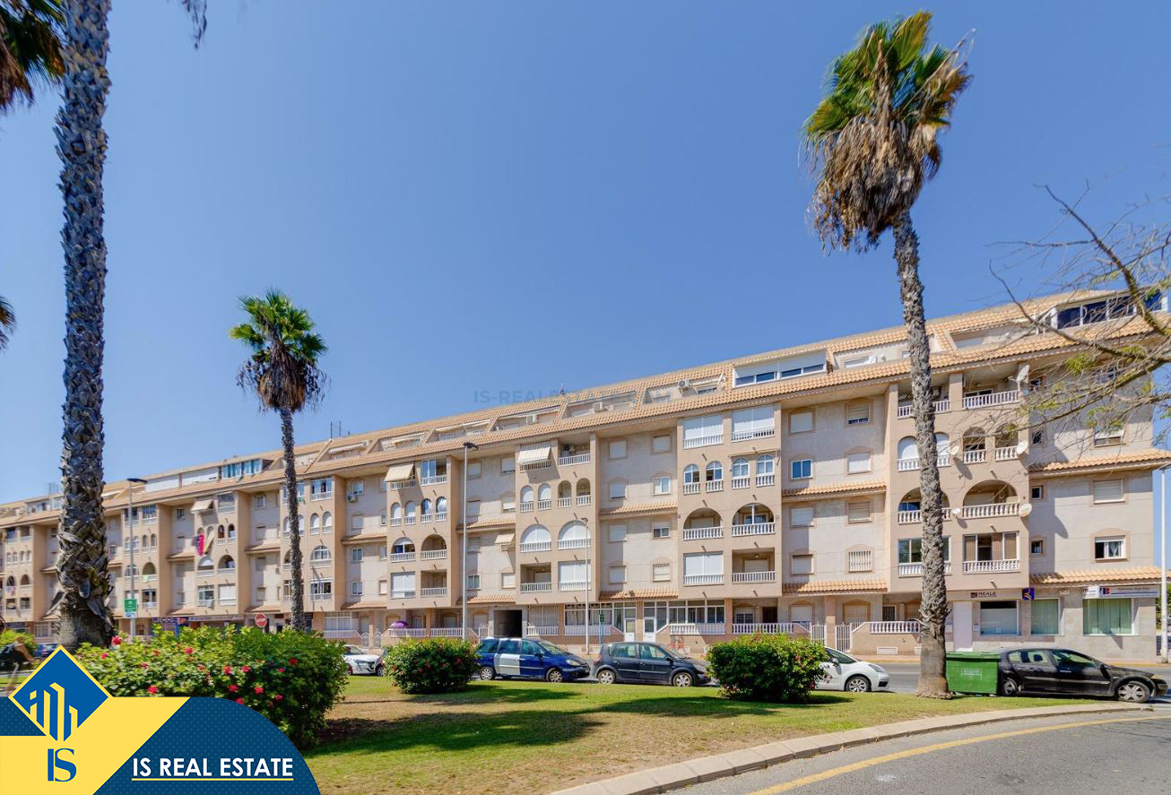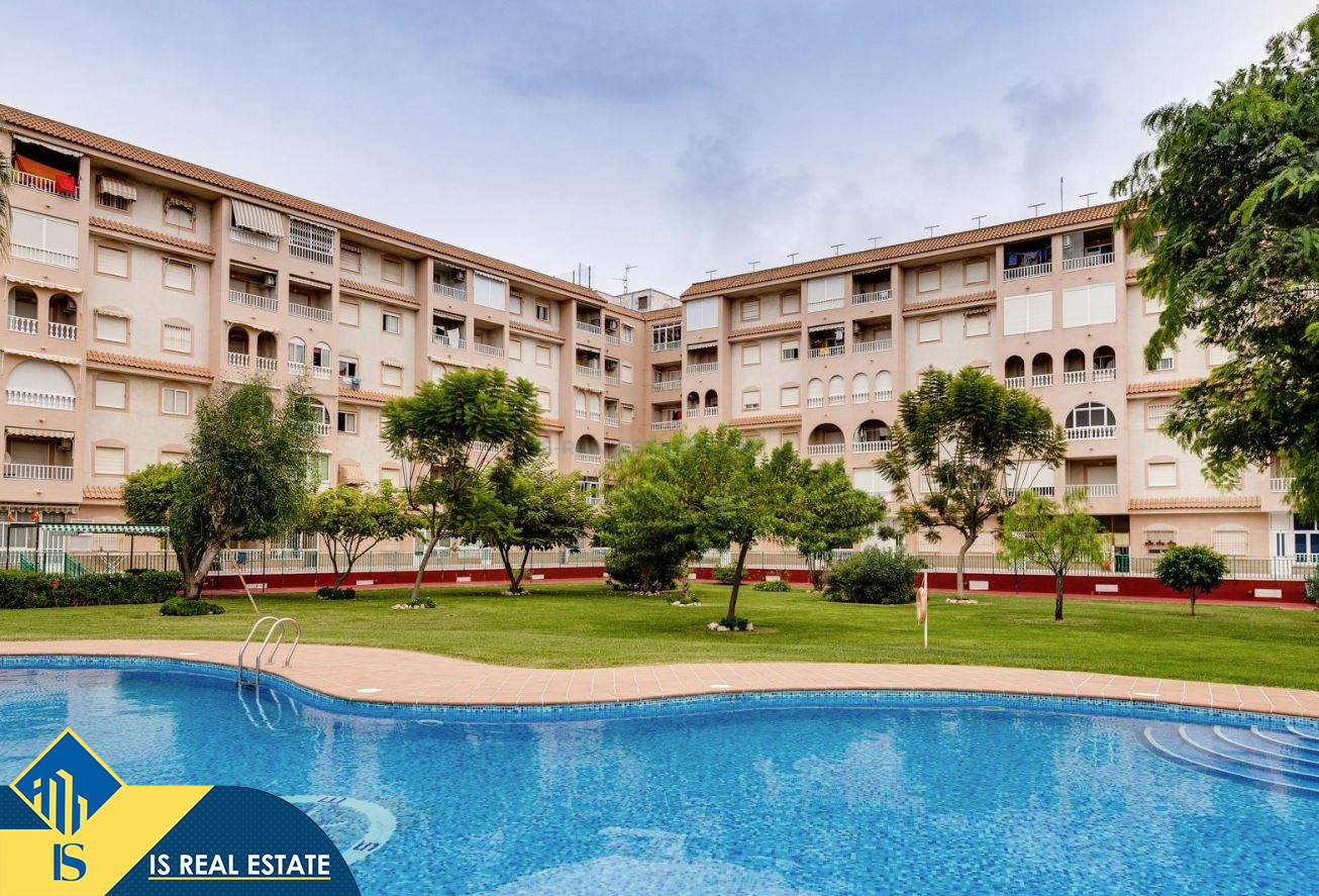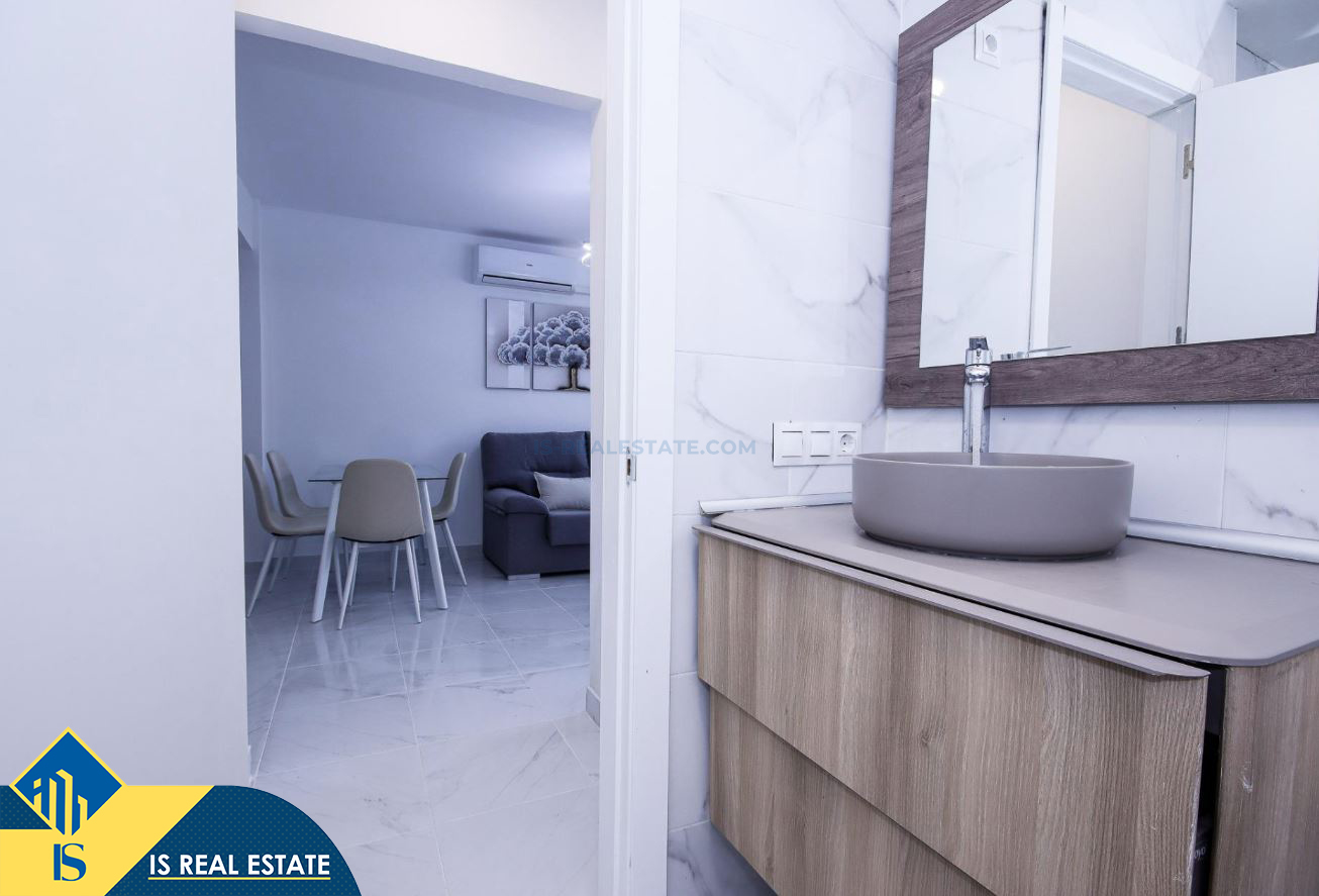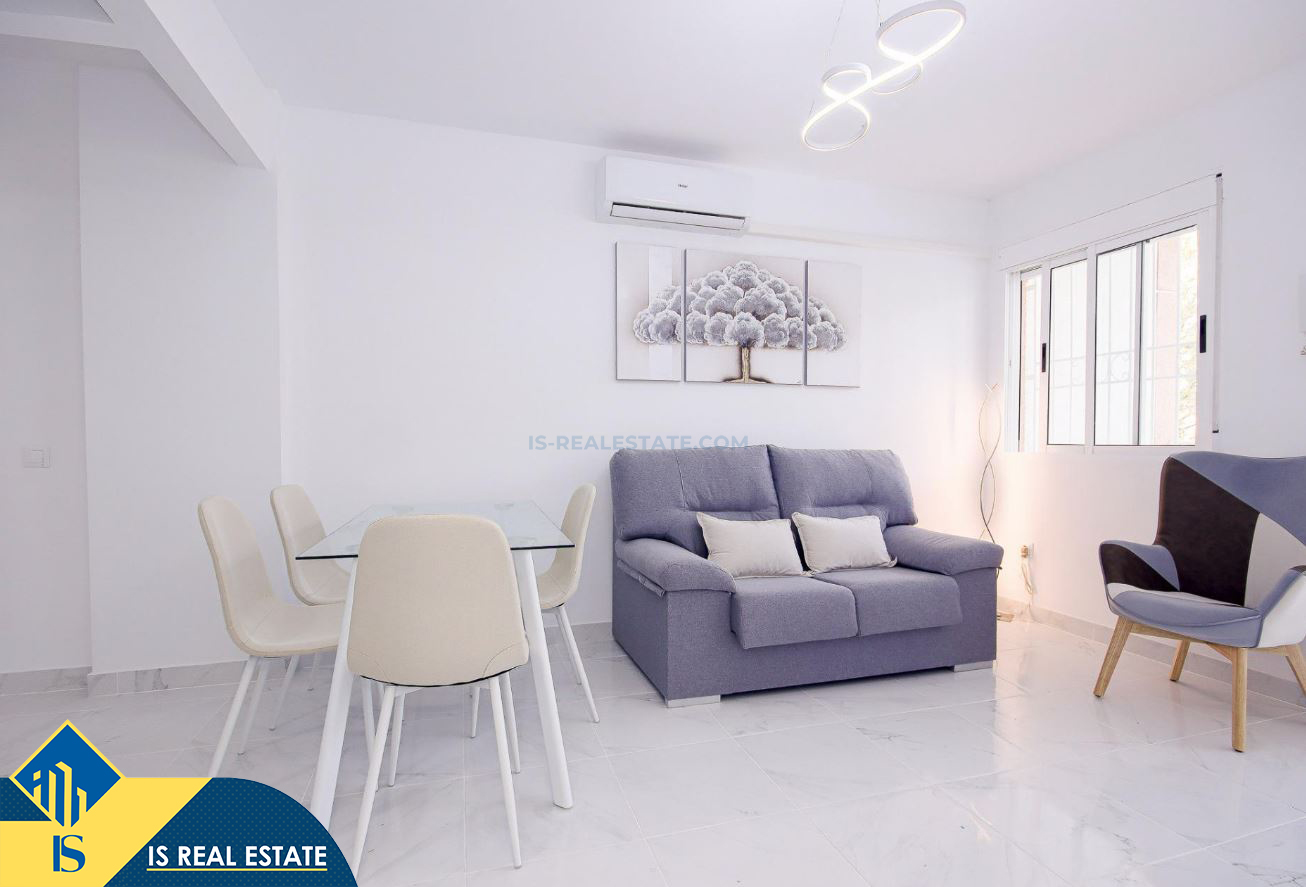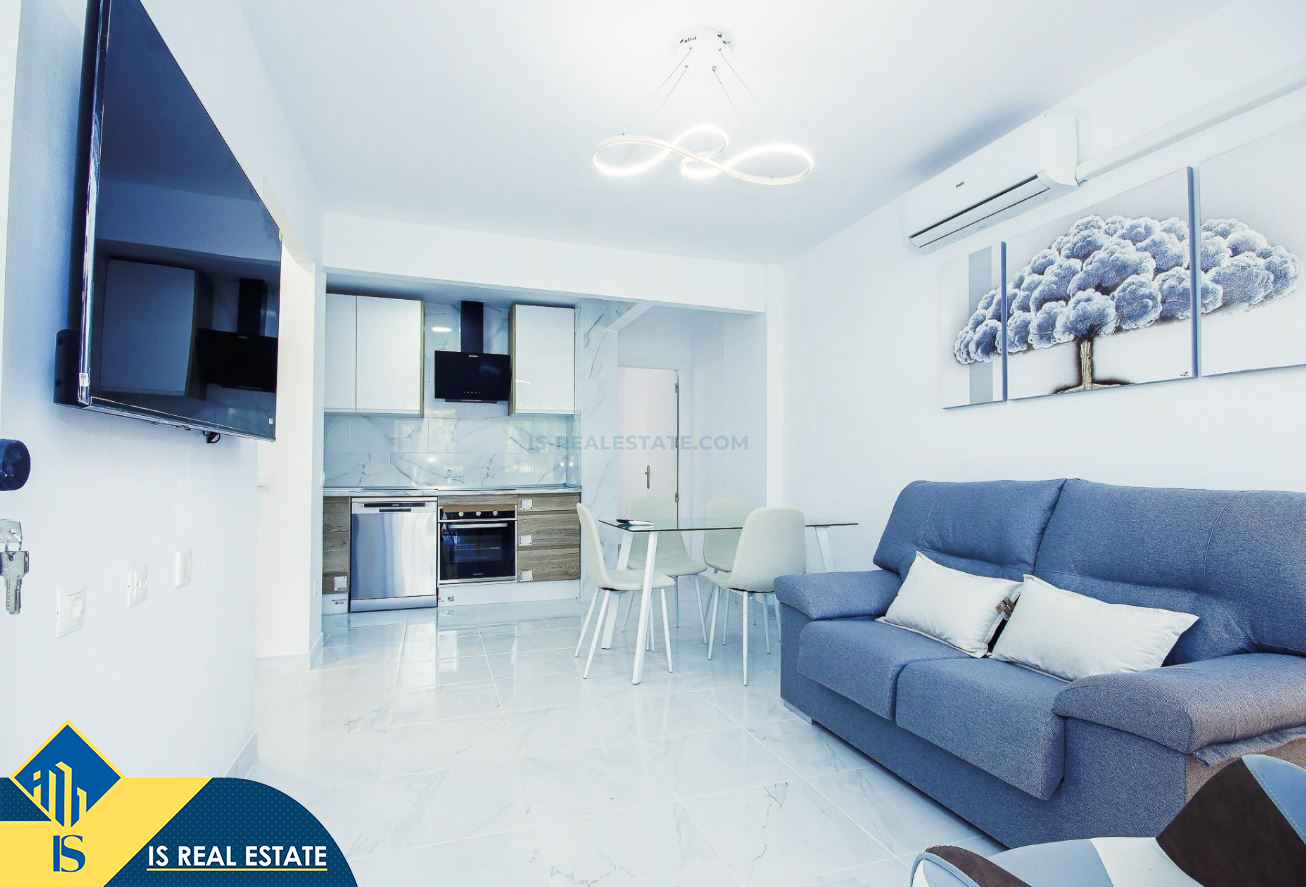 3-jų kambarių renovuotas apartamentas su bendru baseinu, Ispanijoje, Alicante provincijoje, Torrevieja mieste, bendras plotas 52 m², 750 metrų iki jūros, 45 kilometrai iki Alicante oro uosto. Turtui priklauso bendras baseinas, terasa, liftas. Netoli turto yra parduotuvės, restoranai, vaistinės, autobusų stotelės, degalinės, žalios zonos, kavinės