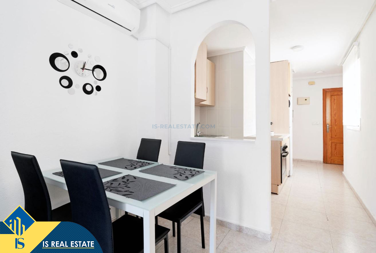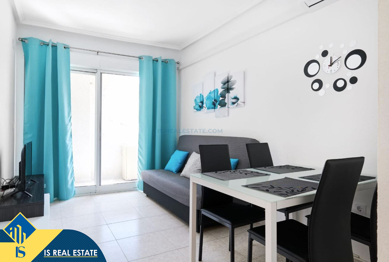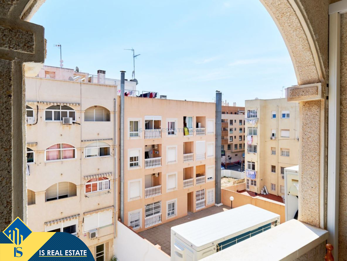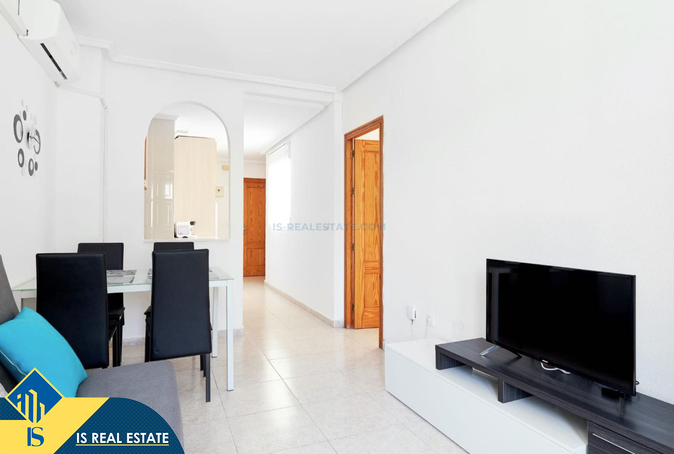 2-jų kambarių apartamentas su terasa, Ispanijoje, Alicante provincijoje, Torrevieja mieste, bendras plotas 49 m², 900 metrų iki jūros, 45 kilometrai iki Alicante oro uosto. Turtui priklauso terasa, liftas. Netoli turto yra parduotuvės, restoranai, vaistinės, autobusų stotelės, degalinės, žalios zonos, kavinės
