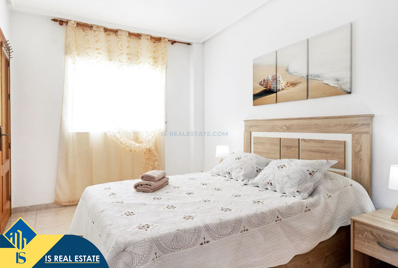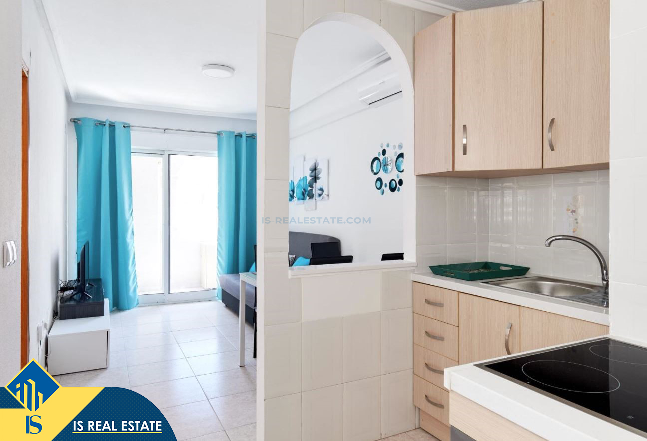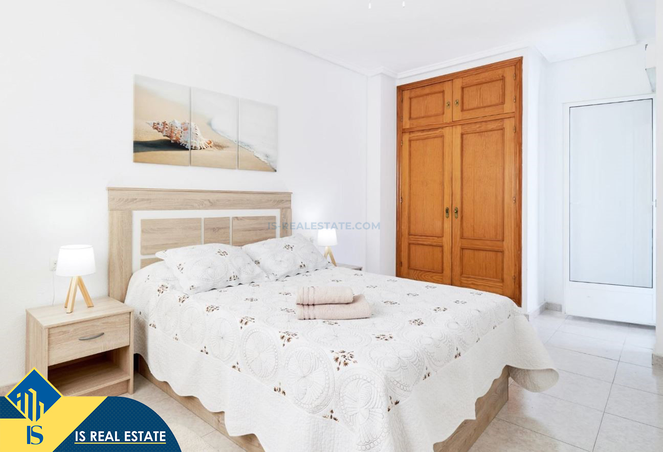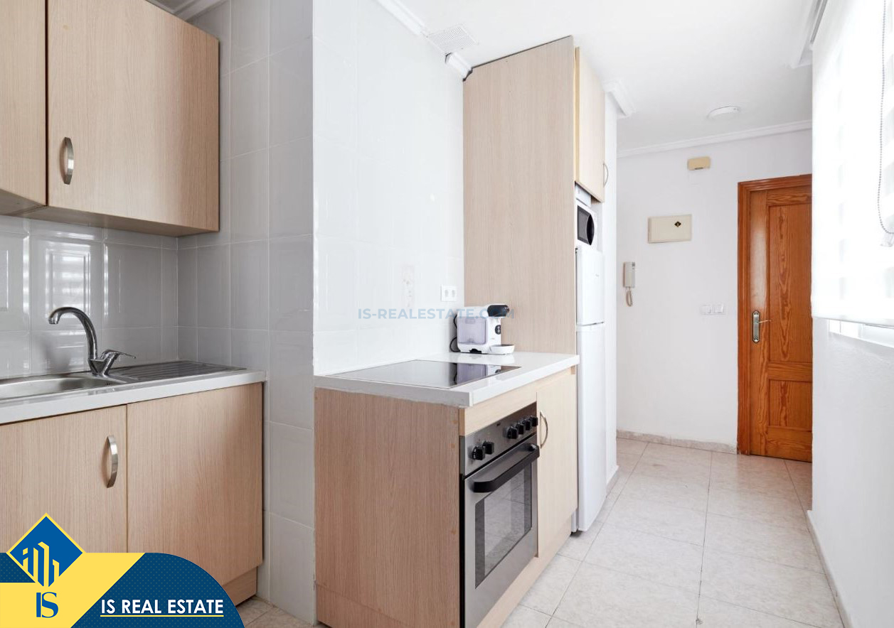 2-jų kambarių apartamentas su terasa, Ispanijoje, Alicante provincijoje, Torrevieja mieste, bendras plotas 49 m², 900 metrų iki jūros, 45 kilometrai iki Alicante oro uosto. Turtui priklauso terasa, liftas. Netoli turto yra parduotuvės, restoranai, vaistinės, autobusų stotelės, degalinės, žalios zonos, kavinės