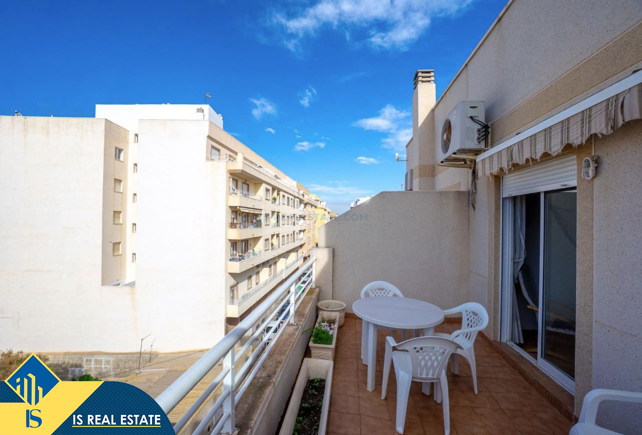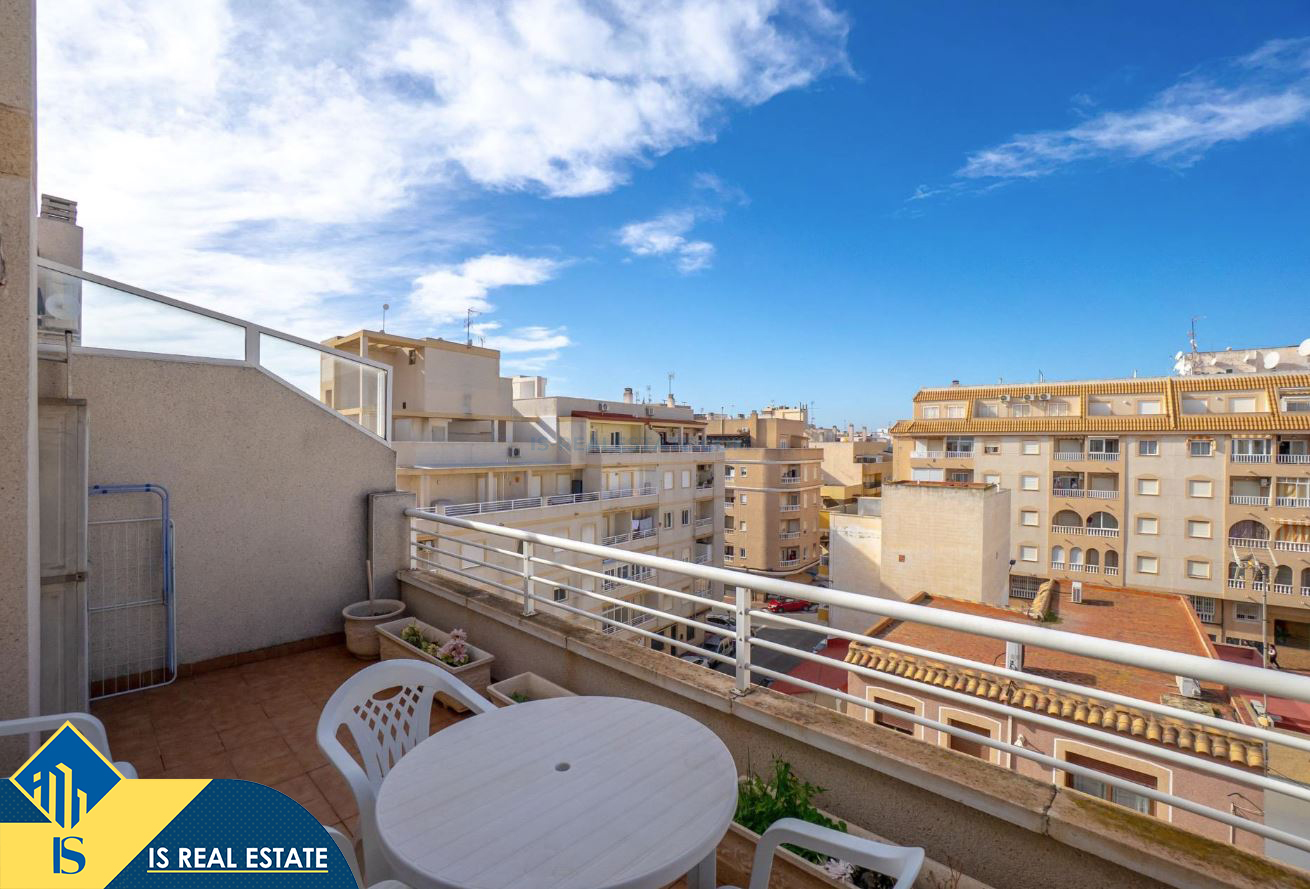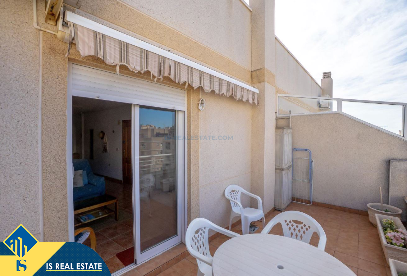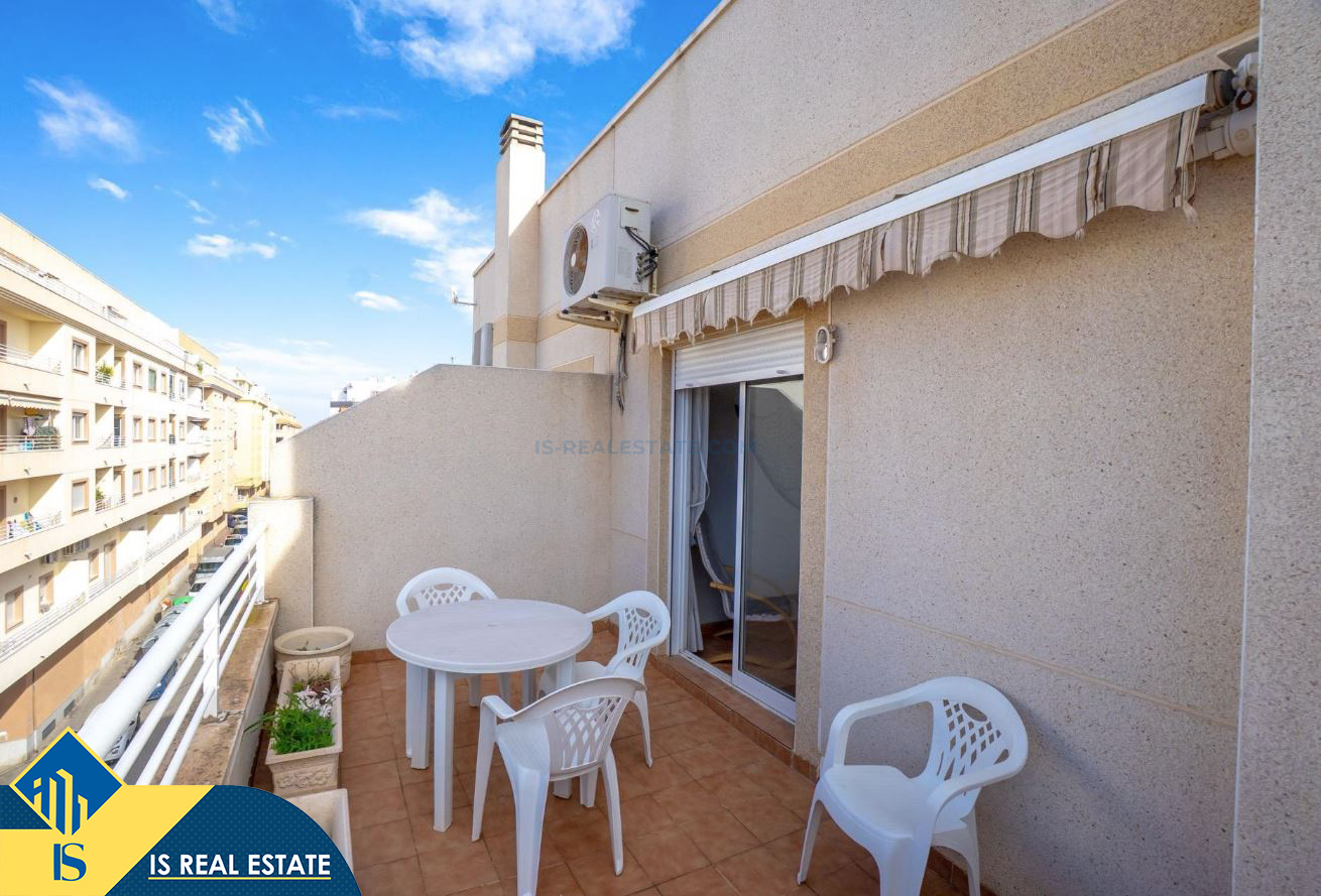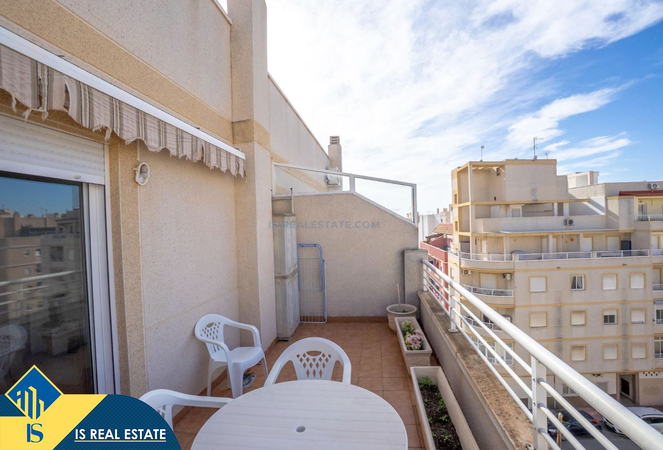 2-jų kambarių penthouse apartamentas su terasa, Ispanijoje, Alicante provincijoje, Torrevieja mieste, bendras plotas 49 m², 1.4 kilometro iki jūros, 45 kilometrai iki Alicante oro uosto. Turtui priklauso terasa, liftas. Netoli turto yra parduotuvės, restoranai, vaistinės, autobusų stotelės, degalinės, žalios zonos, kavinės