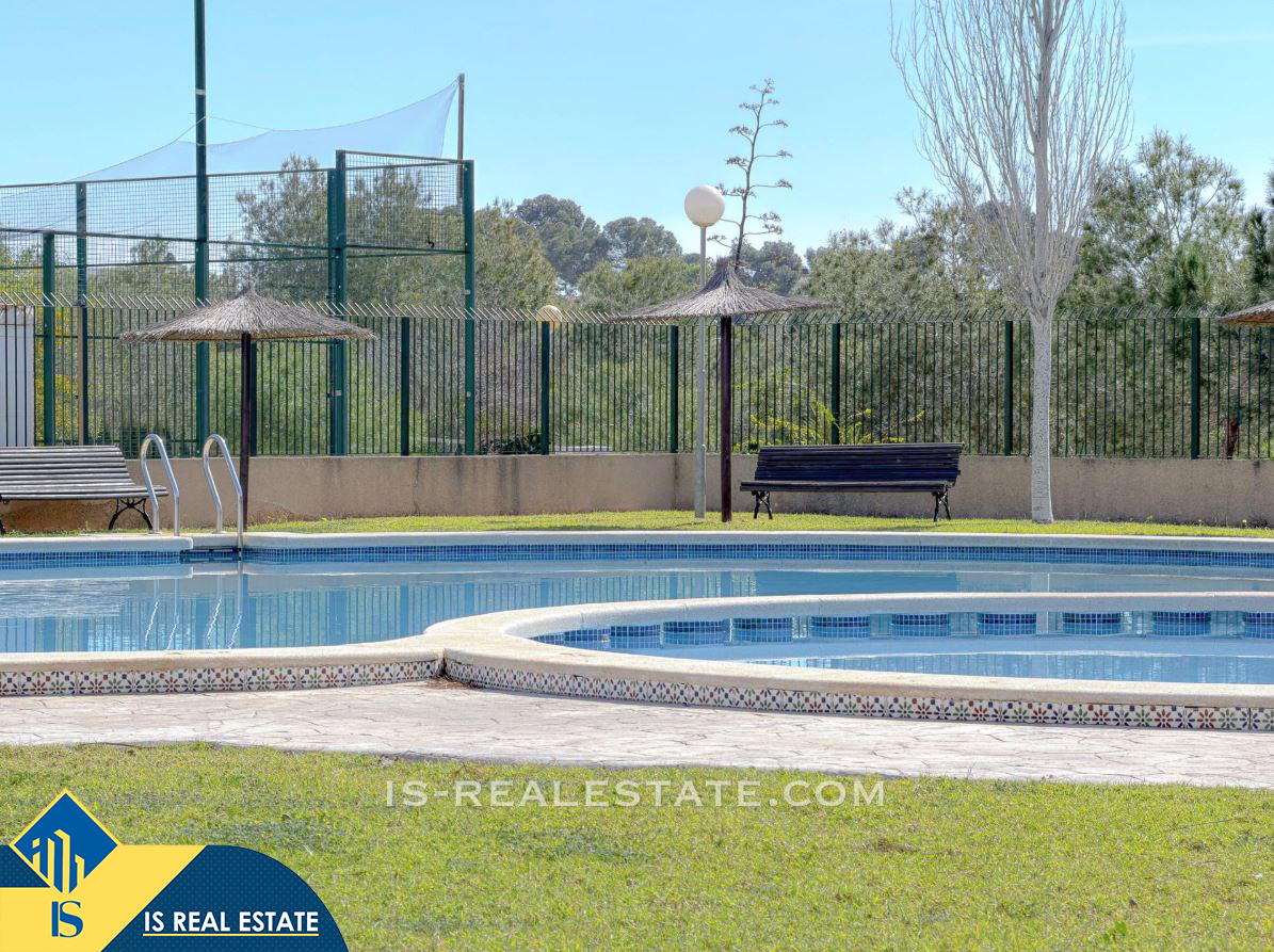 3-jų kambarių bungalas su bendru baseinu, Ispanijoje, Alicante provincijoje, Orihuela Costa mieste, bendras plotas 62 m², 3.5 kilometro iki jūros, 57 kilometrai iki Alicante oro uosto. Turtui priklauso bendras baseinas, terasa, vieta automobiliui. Netoli turto yra parduotuvės, restoranai, autobusų stotelės, vaikų zonos, degalinės, žalios zonos, kavinės, ligoninė