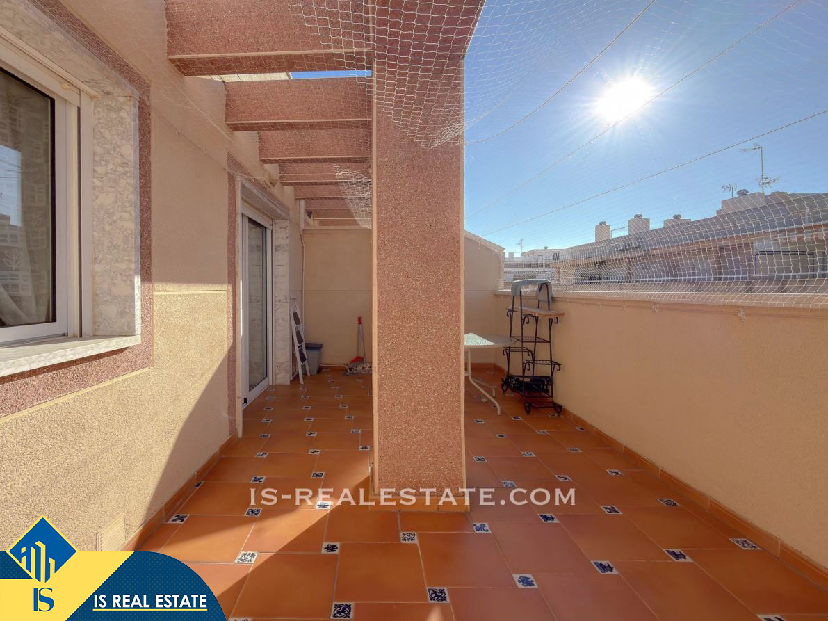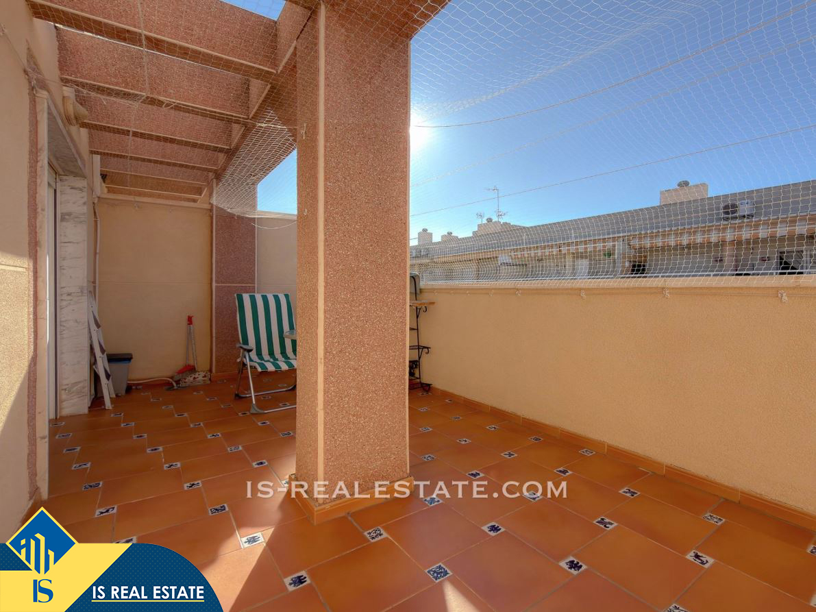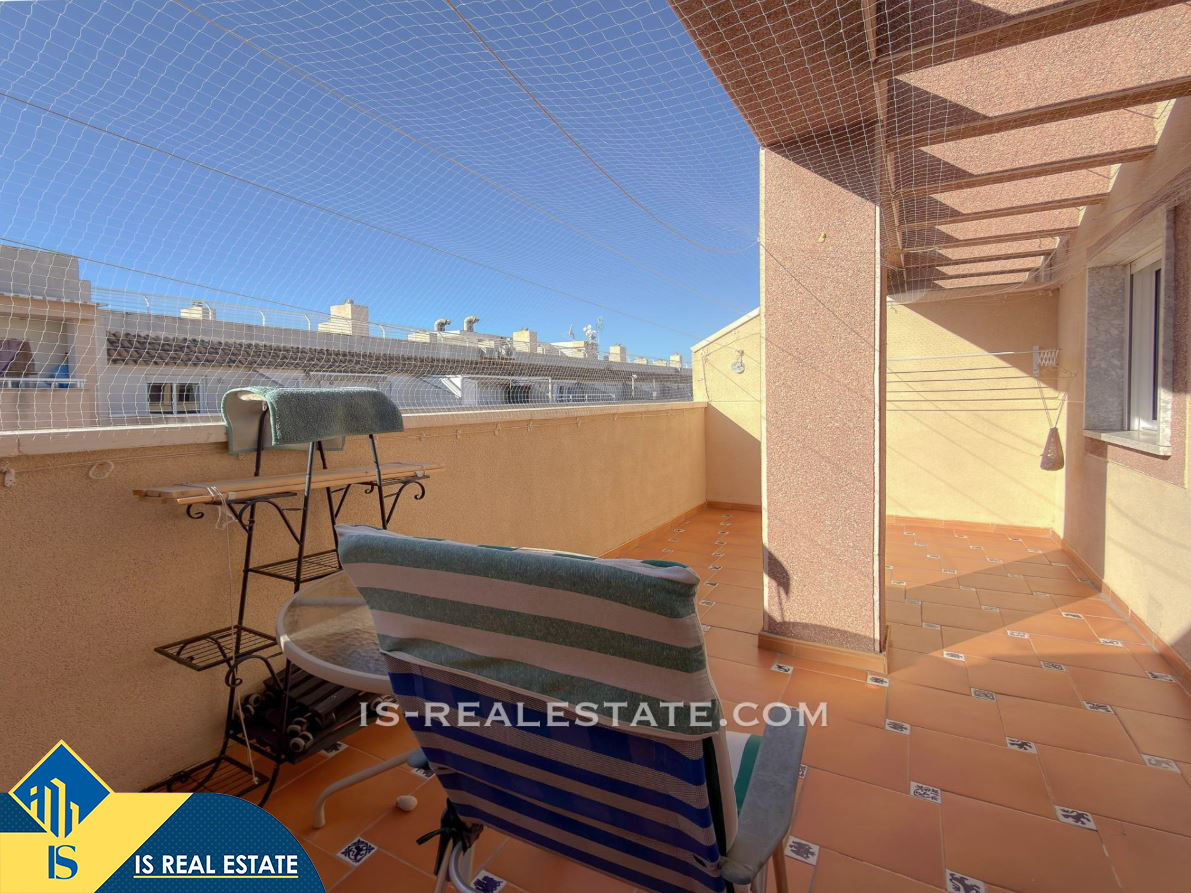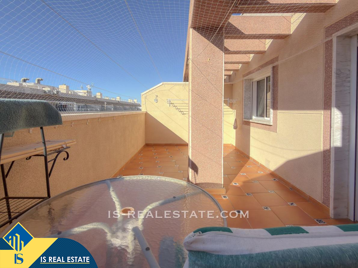 3-jų kambarių penthouse apartamentas su terasa, Ispanijoje, Alicante provincijoje, Torrevieja mieste, bendras plotas 61 m², 700 metrų iki jūros, 45 kilometrai iki Alicante oro uosto. Turtui priklauso terasa, liftas. Netoli turto yra parduotuvės, restoranai, vaistinės, autobusų stotelės, degalinės, žalios zonos, kavinės