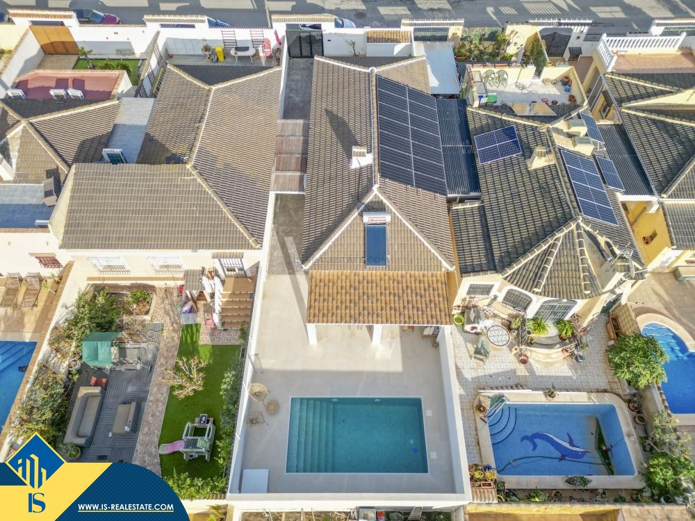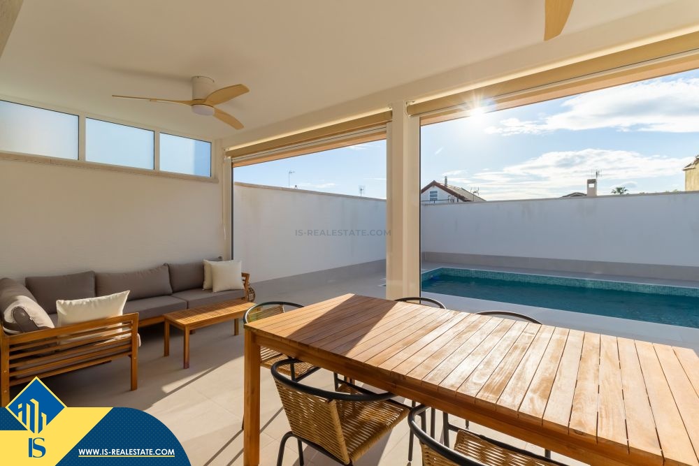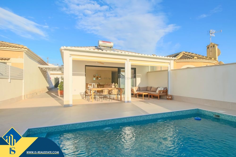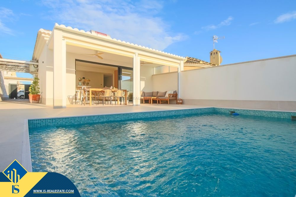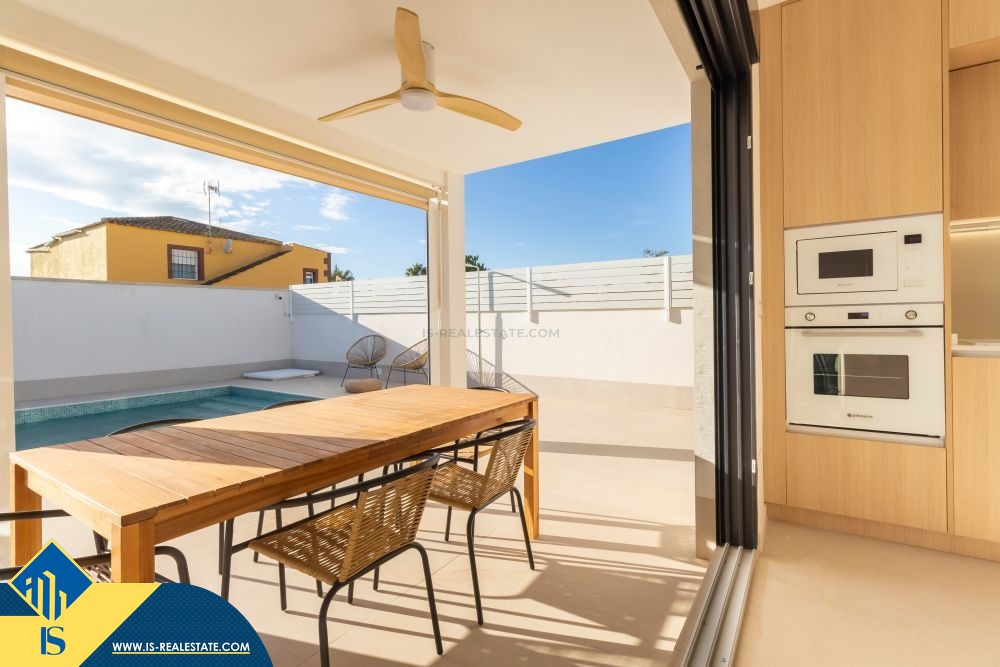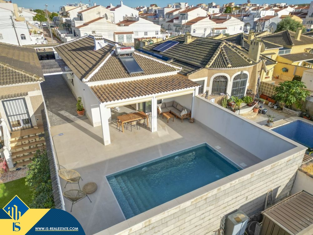 4-ių kambarių vila su privačiu baseinu, Ispanijoje, Alicante provincijoje, Torrevieja mieste, El Chaparral rajone, bendras plotas 100 m², 3 kilometrai iki paplūdimio, 45 kilometrai iki Alicante miesto oro uosto. Turtui priklauso kiemas, privatus baseinas, terasa, vieta automobiliui. Netoli turto yra parduotuvės, restoranai, autobusų stotelės, vaikų zonos, degalinės, žalios zonos, kavinės, vaistinės